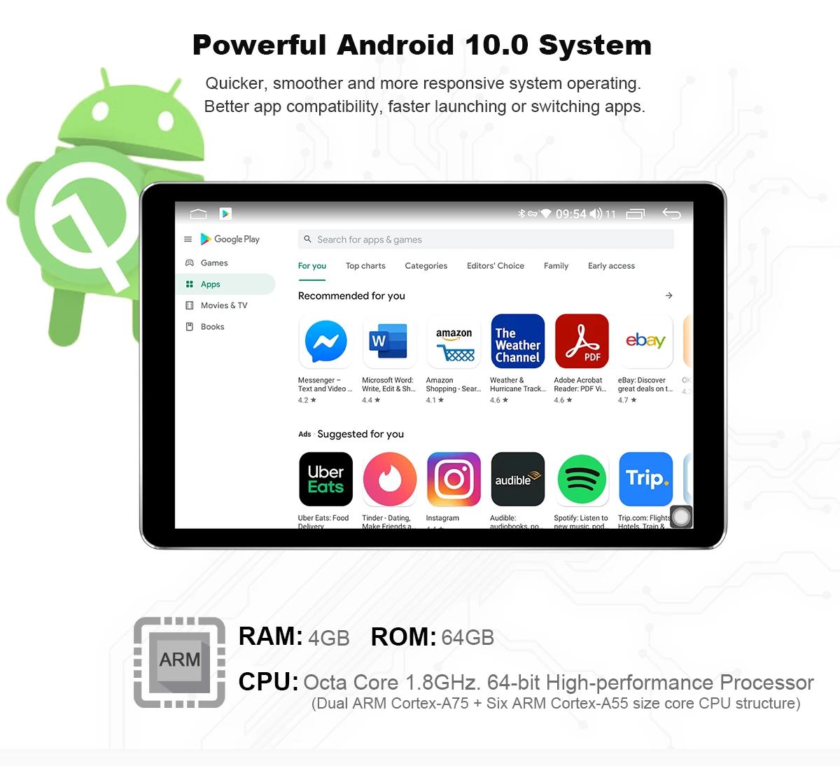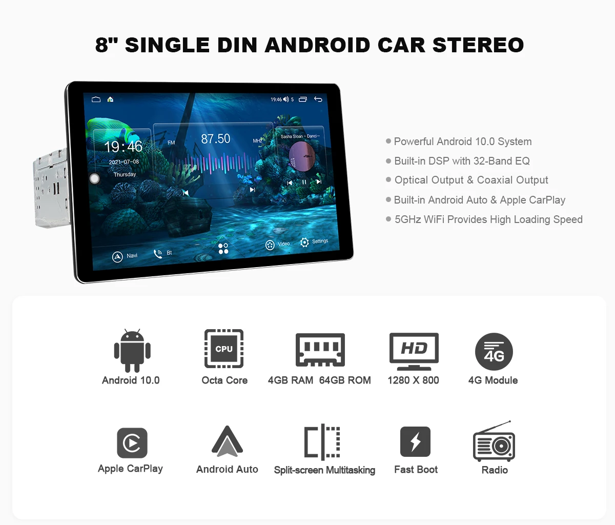 * Мощная система Android 10.0.* CPU:UIS7862 Восьмиядерный 1.8GHz@4.0GB (память) + 64 ГБ (память).* Встроенный Android Auto & Apply Wireless Carplay.* Встроенный слот для sim-карты.* Оптический выход и коаксиальный выход.* Встроенный DSP с 32-полосным эквалайзером.* 5 ГГц WIFI обеспечивает высокую скорость загрузки.* Радиочип TDA7786, чип усилителя: TDA 7851