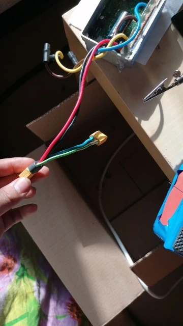 Изоляция как твоя мать, провода как твой стручок (1мм2 достаточно будет) Кушоть дал через основной Xt60 фонарику 60в3а Замыкает основной + (чёрный) две палочки (коричневый) и одну палочку (синий) Две поездки в дождь выдержал, дальше посмотрим