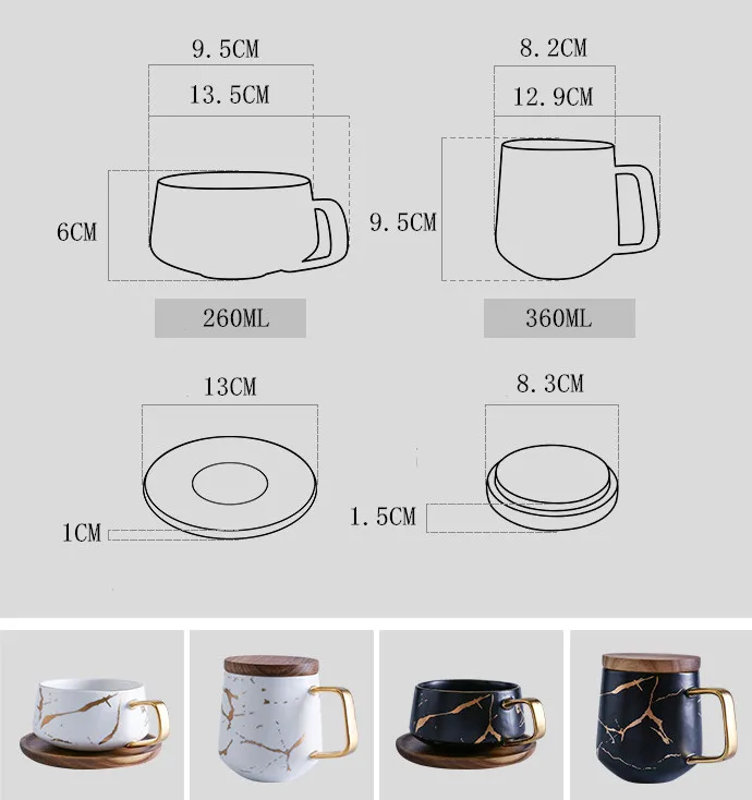Характеристика: Материал чашки: высококачественная керамика Материал крышки/лотка: дерево Емкость чашки с лотком: 260 мл Размер чашки с лотком: 13.5x9.5x6cml Емкость чашки с крышкой: 360 мл Емкость чашки с крышкой: 12,9x8,2X9,5 см Размер лотка: 13x1 см Размер крышки: 8.3x1.5 см Вес нетто: около 400 г Вес упаковки: около 500 г Товары включают: 1 кружка 1 х крышка или лоток