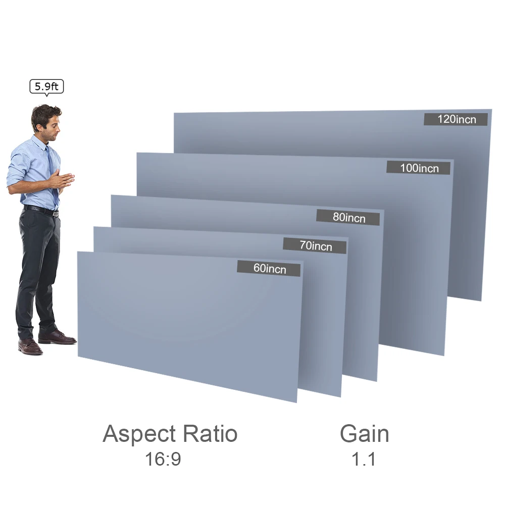 Примечание:72 дюйма на самом деле 70 дюймов, прибл. 155*87 см/61,02*34,25 дюйма,84 дюйма на самом деле 80 дюймов, прибл. 177*100 см/69,68*39,37 дюйма,Пожалуйста, внимательно проверьте это перед оформлением заказа, спасибо.Обзор:Это безрамный проекционный экран с наклейками, который легко установить на стену или снять с него. Он равномерно рассеивает проектируемый светильник, и вы испытаете идеальное визуальное наслаждение с оптимальным изображением и цветопередачей. Его можно сложить как можно меньше и не займет много места, удобно брать с собой куда вы идете. Он универсально совместим с большинством светодиодный, LCD или DLP проекторов на рынке. Изготовлен из полиэфирного материала, легко моется, влагостойкий, не выцветает при длительном использовании, без запаха.Особенности:Это безрамный проекционный экран с наклейками, который легко установить на стену или снять с него.Серый экран эффективно улучшает контрастность проекции. Слой покрытия с бусинами увеличивает яркость. Не нужно закрывать двери и окна в течение дня, чтобы испытать отличную проекцию.Он равномерно рассеивает проектируемый светильник, и вы испытаете идеальное визуальное наслаждение с оптимальным изображением и цветопередачей.Подходит для домашнего кинотеатра, обучения в классе, презентаций конференц-зала, общественного дисплея и т. д.Складная конструкция не займет много места, удобно брать с собой куда угодно. Его можно гладить паровым утюгом с задней стороны.Изготовлен из полиэфирного материала, легко моется, влагостойкий, плесень, не выцветает в течение длительного времени, без запаха и деформации.Примечание: проектор и экран линейные, и зритель находится спереди. Лучший угол обзора 0-10 °.Характеристики:Материал: полиэстер и оптическое покрытиеФормат экрана: 16:9Основной цвет: серыйДлина диагонали: 60 дюймов, 70 дюймов, 80 дюймов, 100 дюймов, 120 дюймов (опционально)60 дюймов:Размер экрана: 132*75 см/51,96*29,52 дюймаВес экрана: 156 г/5,50 унций70 дюймов:Размер экрана: 155*87 см/61,02*34,25 дюймаВес экрана: 212 г/7,47 унций80 дюймов:Размер экрана: 177*100 см/69,68*39,37 дюймаВес экрана: 280 г/9,87 унций100 дюймов:Размер экрана: 221*124 см/87,00 * 48.81inВес экрана: 430 г/15,16 унций120 дюймов:Размер экрана: 265*150 см/104,33 * 59.05inВес экрана: 635 г/22,39 дюймаПосылка:1 * проекционный экран![]()