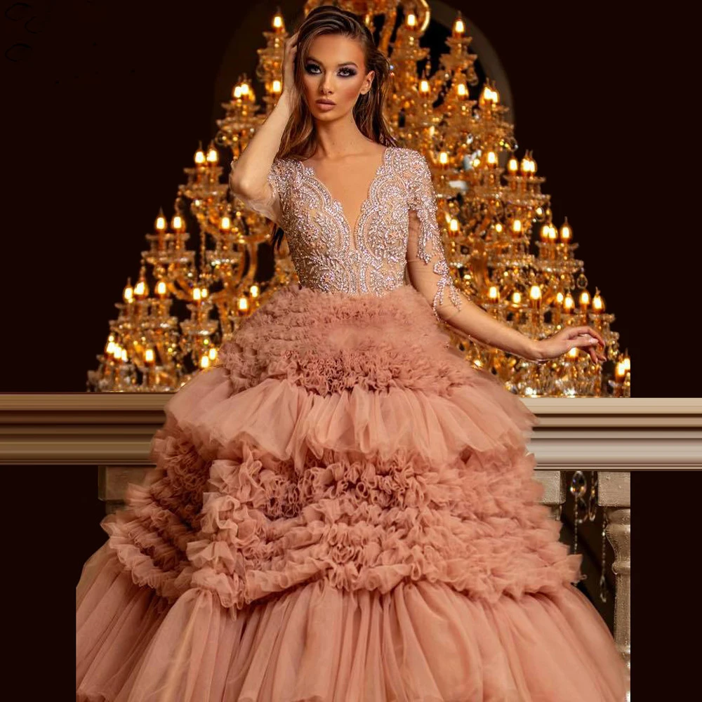 Женское Пышное Тюлевое платье для выпускного вечера, модель 2020, вечернее платье с оборками, роскошное вечернее платье с бисером, индивидуальный пошив