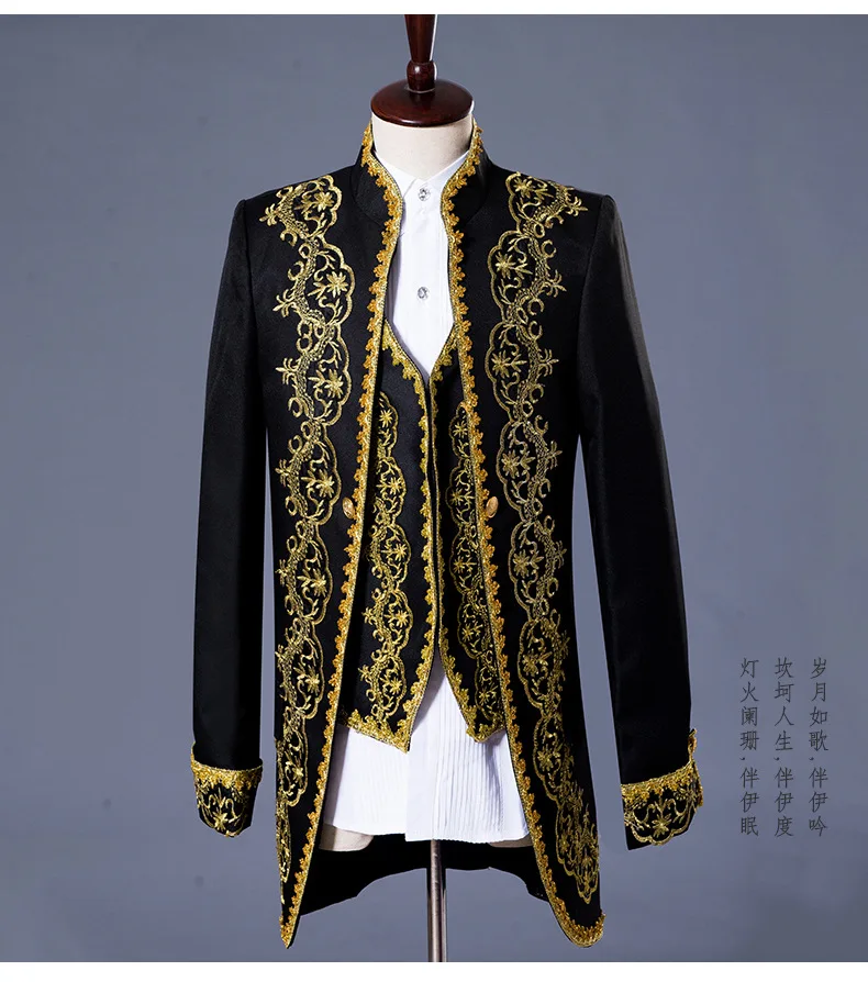 Длинное Мужское пальто с золотистой аппликацией, Королевский винтажный Модный костюм для выступления в стиле театра оперы, представления с Европейским Эрлом, вечерняя одежда