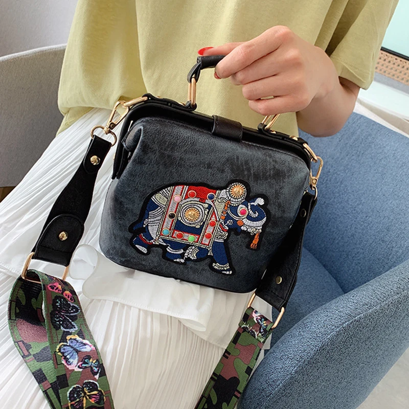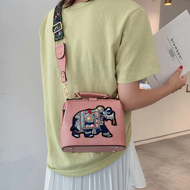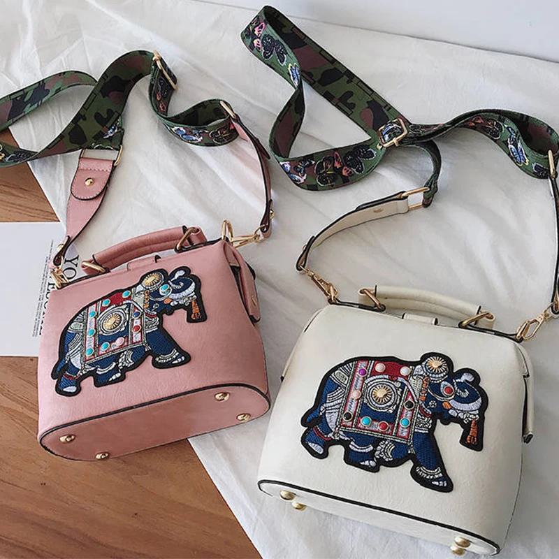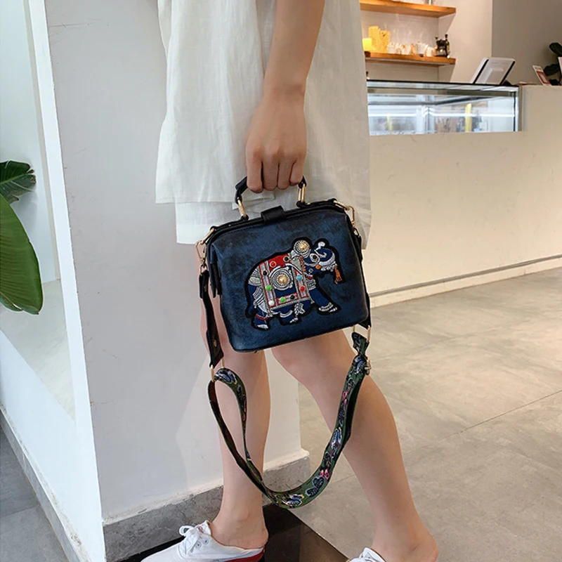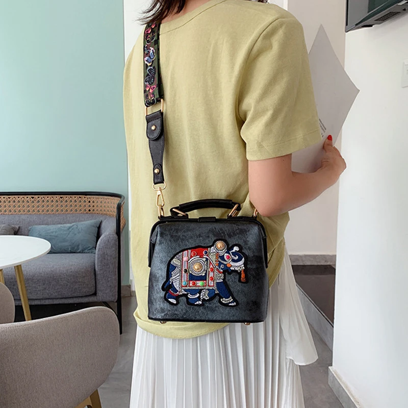 Сумка на плечо женская с вышивкой слона, саквояж кросс-боди из искусственной кожи в винтажном стиле, сумочка-мешок с широким ремешком, Дамский кошелек