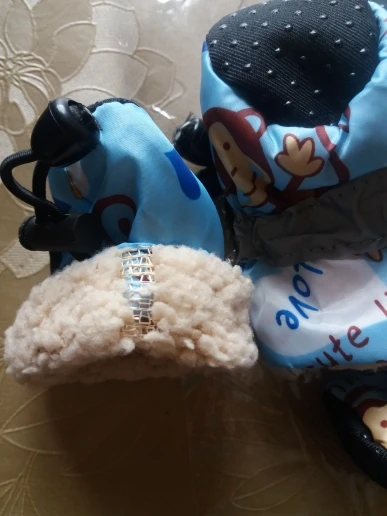 Ботиночки с внутренней стороны утеплены искусственным мехом. Есть светоотражающая полоска. Держится обувь за счет резинки, которая закрепляется на фиксаторы. Это, пожалуй, единственная обувь, которая хорошо держится на маленьких, тоненьких лапках чишки Капы. Думаю купить еще одни такие.