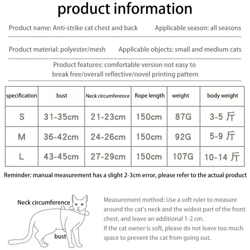 Тип: ремни Материал: полиэстер/сетка Тип: собаки/кошки Рисунок: Милый принт Особенность: мягкий Цвет: красный, зеленый, синий, розовый, Подходящий сезон: все сезоны Подходящие объекты: маленькие и средние кошки Таблица размеров: Размер ------- грудь ------------------ Шея ------- Длина тягового каната ------- рекомендуемый вес S-----31-35 см/12,20-13,77 дюйма --- 21-23 см/8,26-9,05 дюйма ------ 150 см/59,05 дюйма --------- 1,5-2,5 кг M-----36-42 см/13,77-15,74 дюйма --- 24-26 см/9,44-10,23 дюйма ----- 150 см/59,05 ---------- 2,5-4,5 кг L------43-45 см/16,14-17,71 дюйма --- 27-29 см/10,62-11,41 дюйма ---- 150 см/59,05 дюйма --------- 5-7 кг Особенности: Цветной дышащий сетчатый бюстгальтер 1. Ткань для нагрудного чехла изготовлена из воздухопроницаемой сетчатой ткани, подходящей для всех сезонов, в удобном варианте нелегко разорвать 2. Общее отражение, новый рисунок печати, простой и сверхлегкий дизайн позволяет собаке носить без нагрузки и давления. 3. Регулировка + фиксация пряжки, многослойная защита, домашних животных нелегко оторвать, легко носить и регулировать; 4. Металлическая D-образная Пряжка хромированная, с хорошим блеском, не ржавеет и очень прочная; 5. Подходит для маленьких и средних собак; Посылка: 1 х Набор шлейки и поводка для собак