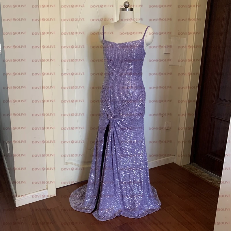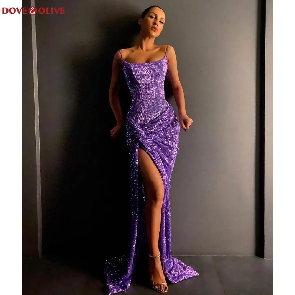 Фиолетовое длинное вечернее платье с блестками, облегающее платье на тонких бретельках с разрезом спереди, с глубоким вырезом, без рукавов, для выпускного вечера