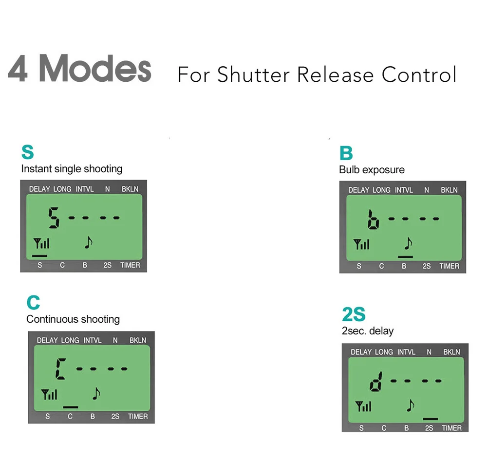 Одиночная съемка, 2 режима задержки, непрерывная съемка, воздействие лампы и доступны.С ЖК-экрана с подсветкой передатчика можно получить доступ к нескольким настройкам времени, таким как возможность установить несколько снимков от 1-999 или бесконечно делать фотографии. Продолжительность экспозиции также может быть установлена до 99 часов 59 минут и 59 секунд с шагом в одну секунду.