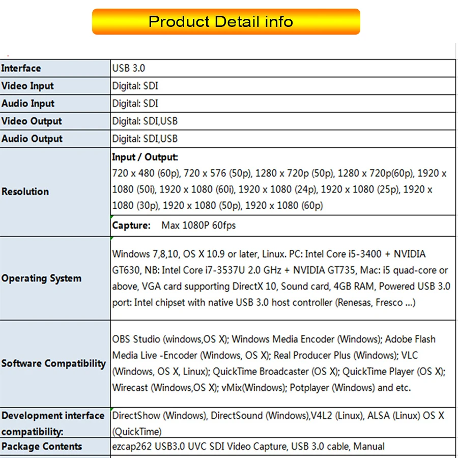 [Запись видео из SDI в USB 3,0]-- На основе высокоскоростной технологии USB 3,0, он может захватывать источники видео SDI HD. Подходит для устройств с выходом SDI, таких как HD-камера, HD медицинский эндоскоп, медицинская визуализация, ТВ, игровой процесс