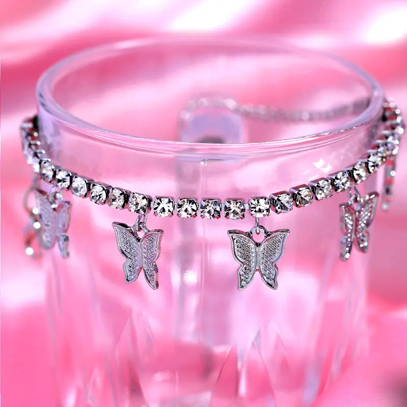 Новая мода Золотой Серебряный Цвет Стразы Теннисный браслет ювелирные изделия для женщин Кристалл Бабочка Кулон ножной браслет пляжная цепочка для ног