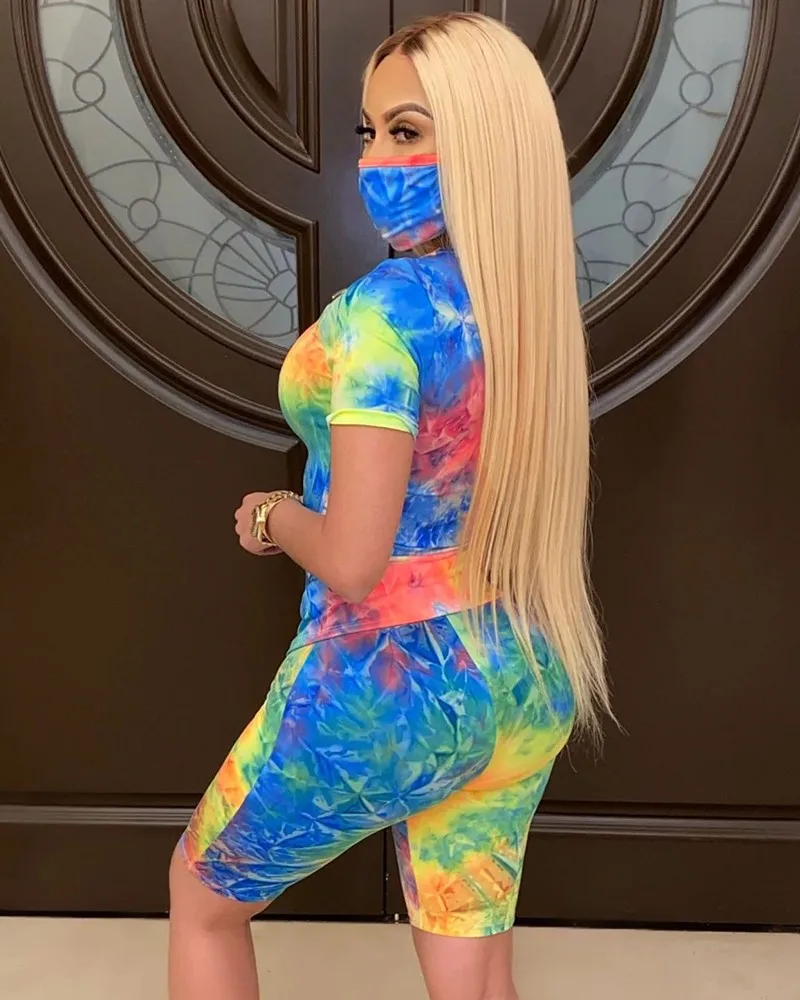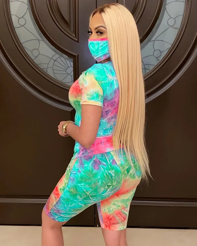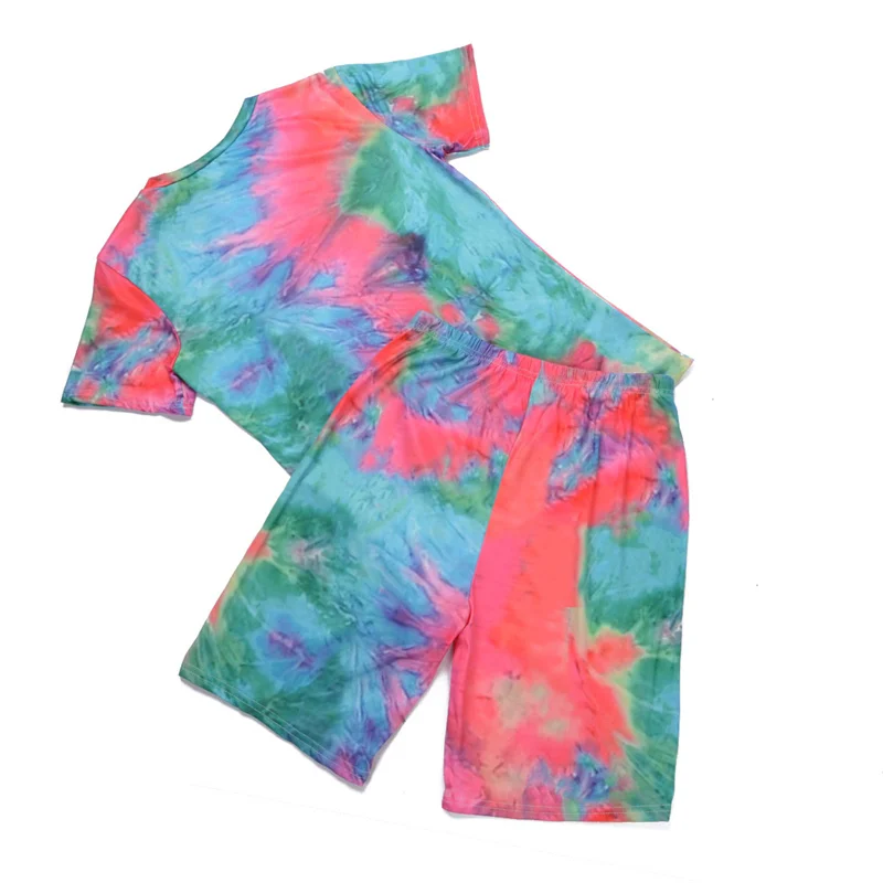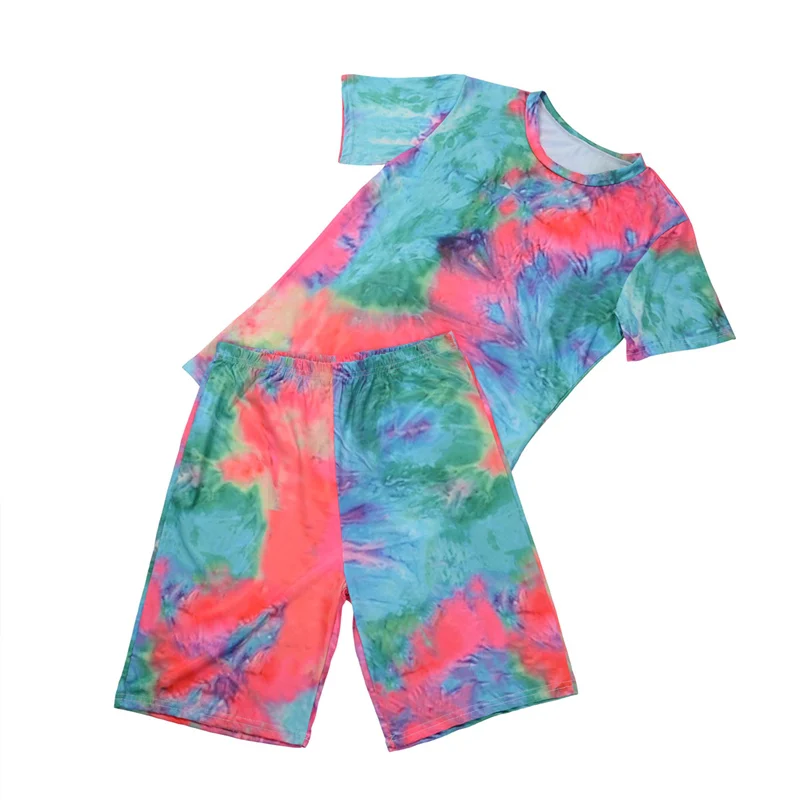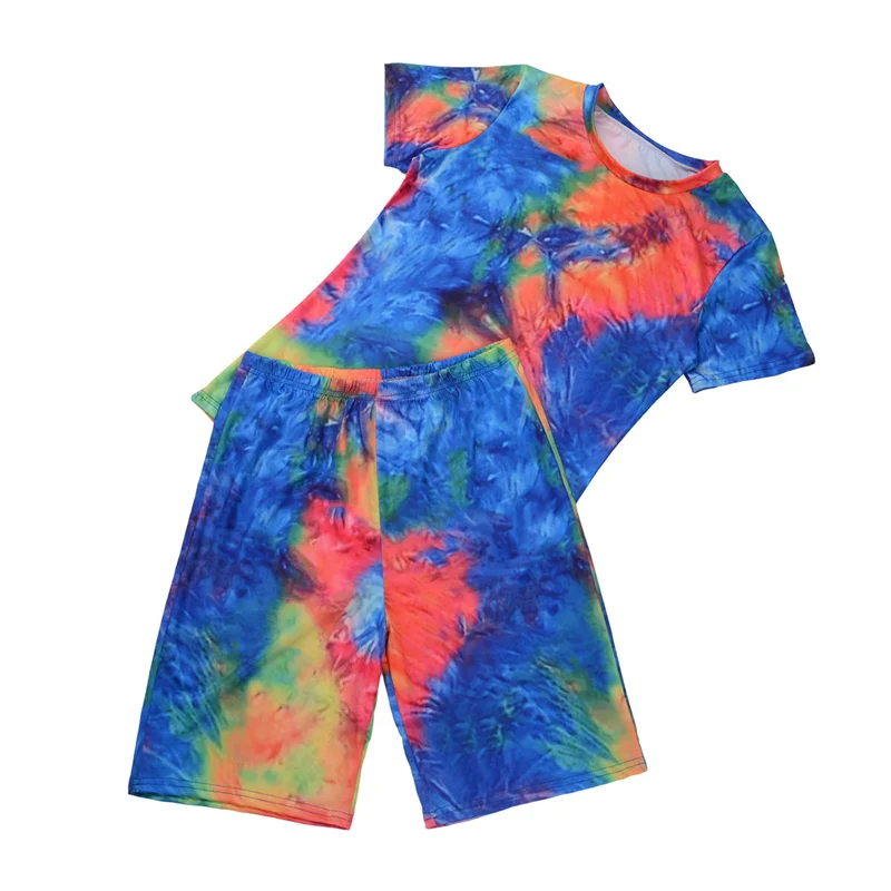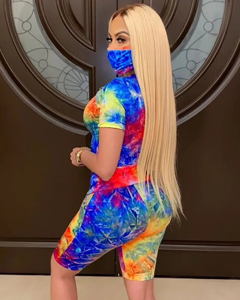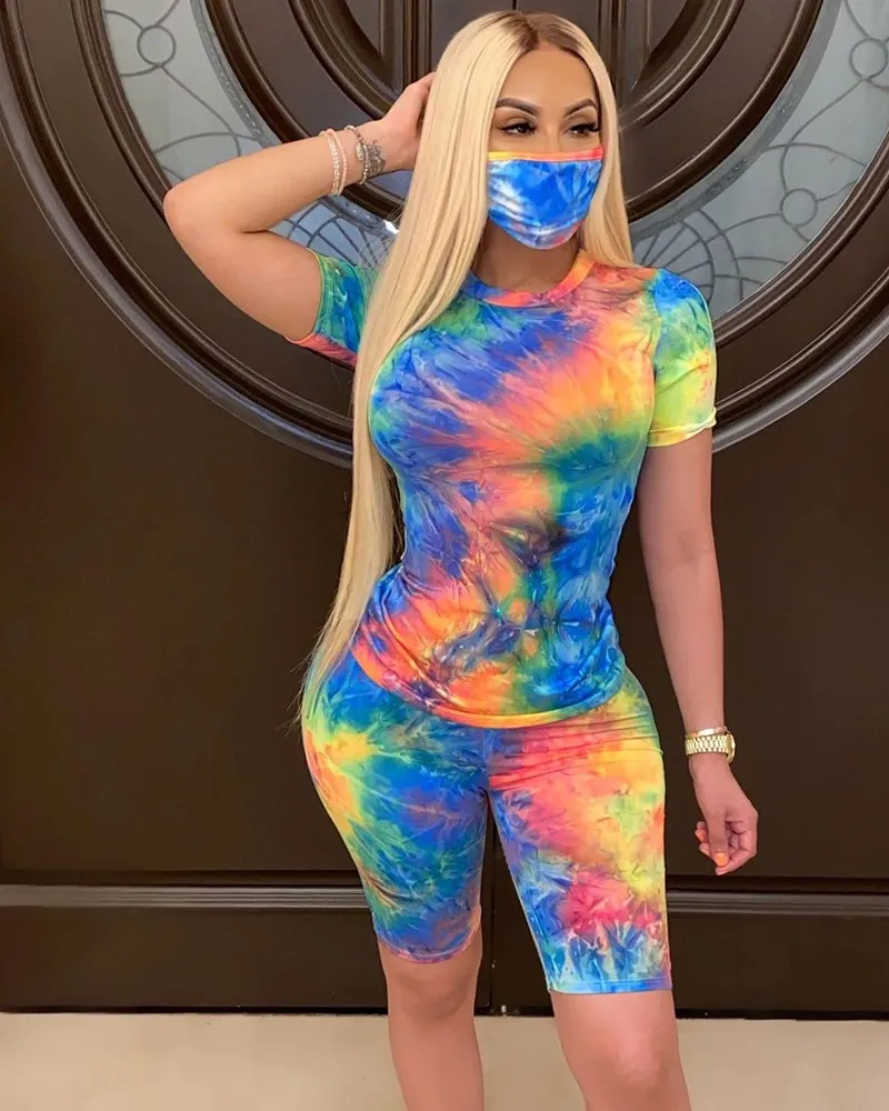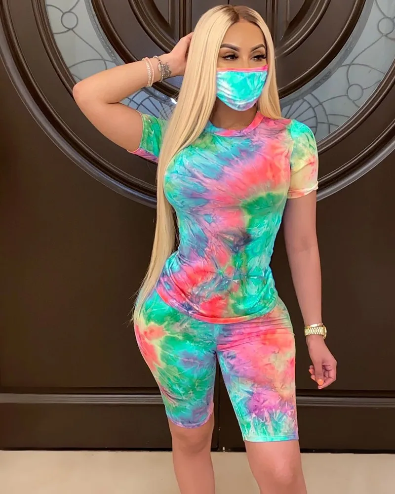 Женский спортивный костюм с принтом, футболка с коротким рукавом и круглым вырезом и шорты с высокой талией