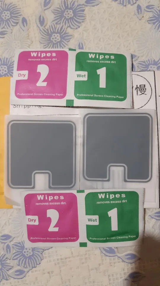 Две плёнки, на каждую по две салфеточки, сухая и влажная. Пришли на ту модель, что я заказывала, размер не проверяла