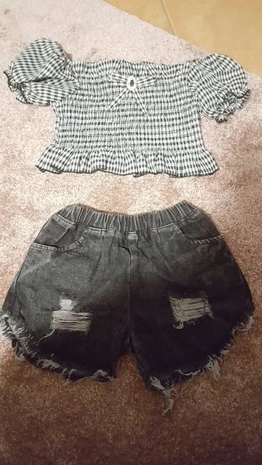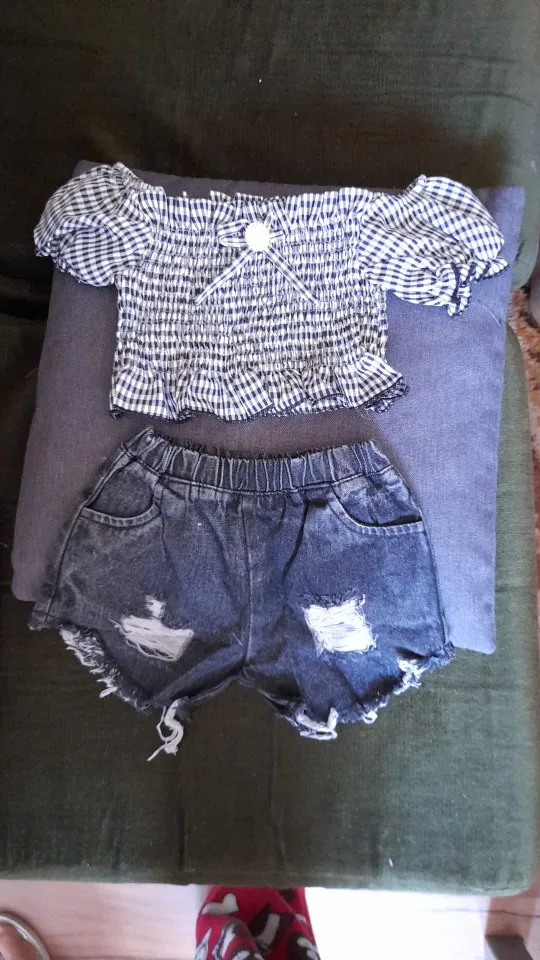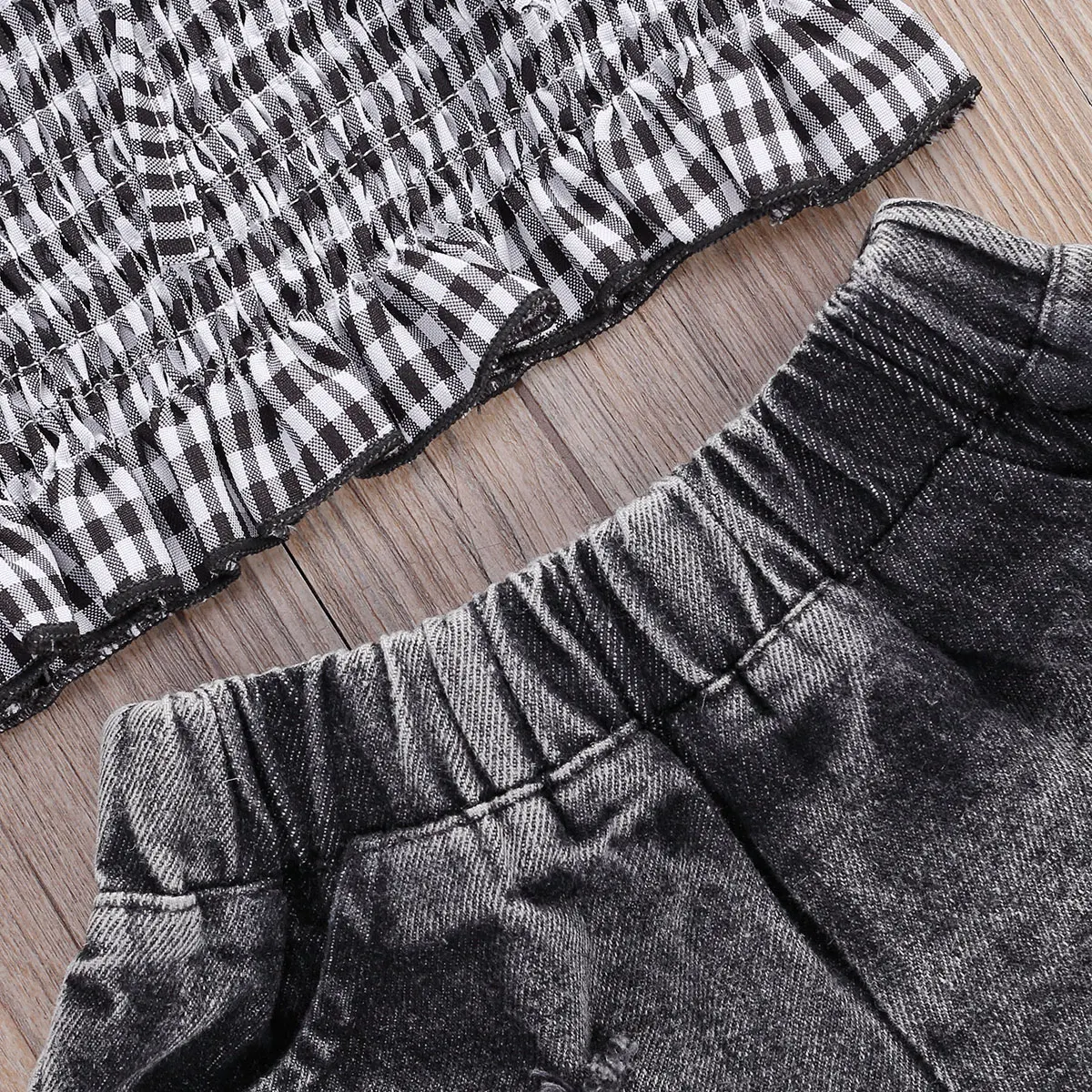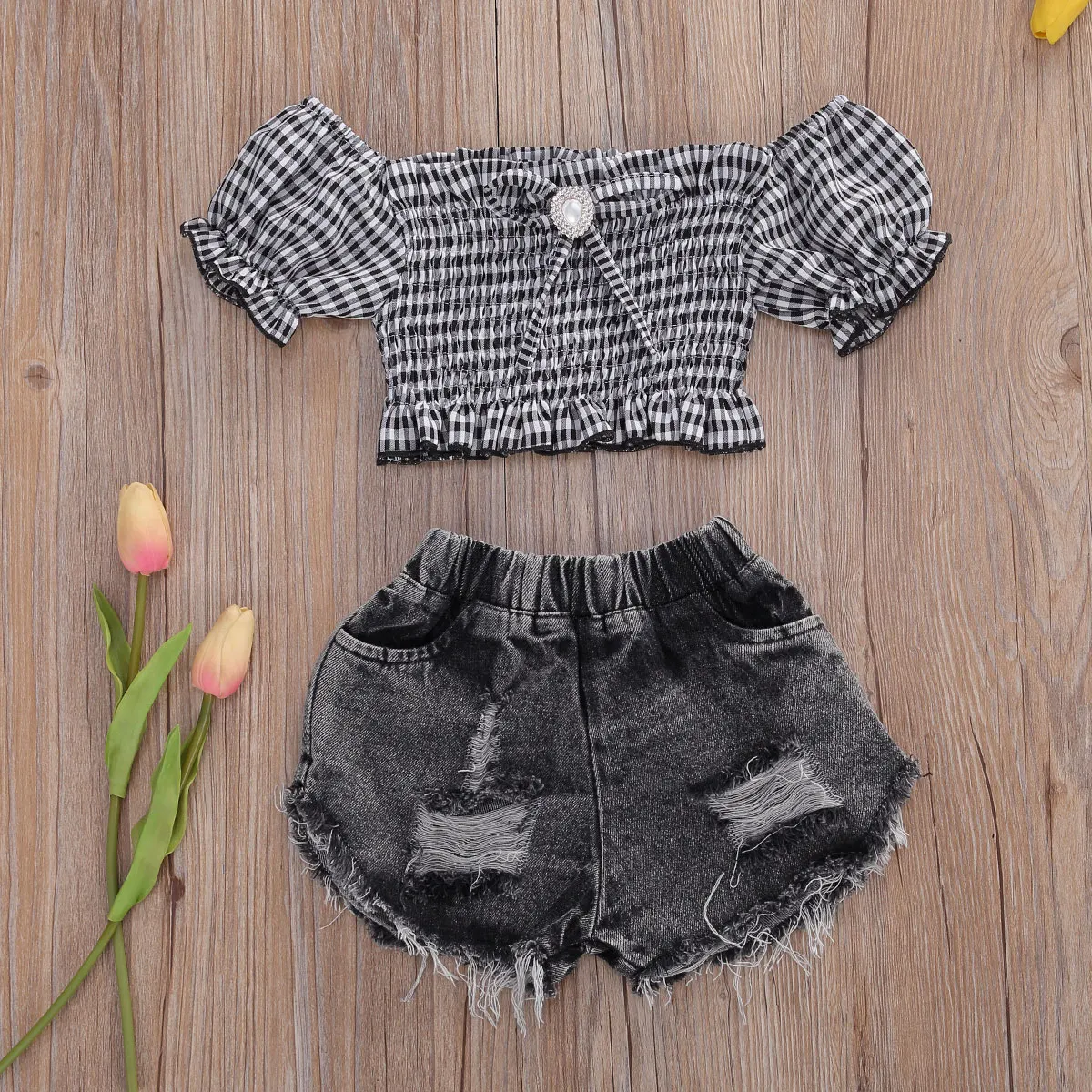 Комплекты одежды для маленьких девочек, футболка в клетку с коротким рукавом и открытыми плечами, топы, джинсовые шорты, 2 шт., летняя модная одежда для малышей, От 2 до 9 лет