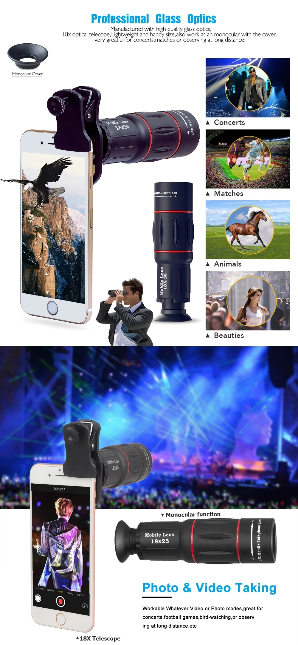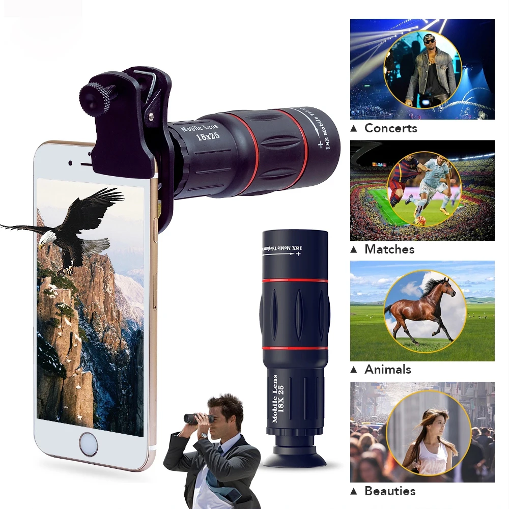 1. Телескоп имеет 18 кратное увеличение, с помощью которой можно регулировать фокусное расстояние хорошо. 2. Телескоп может использоваться в качестве монокуляр. 3. Подходит для большинства мобильных телефонов, включая флип-телефоны и бар-телефоны, 4. Телефон имеет заднюю камеру, может быть подключен к телескопу через зажим. 5. Мобильный телефон качество изображения может быть более очевидно. 6. Подходит для просмотра игр, концертов, туризма, наблюдения за животными, съемки на дальние расстояния и т. Д. 7. Частный детектив фотографирует экспертизу, геологоразведку, управление лесным хозяйством, планирование железнодорожных портов и т. Д.