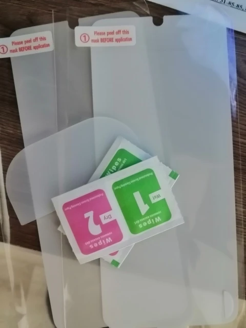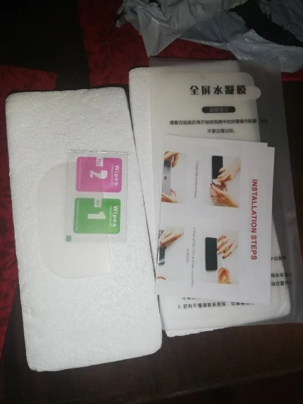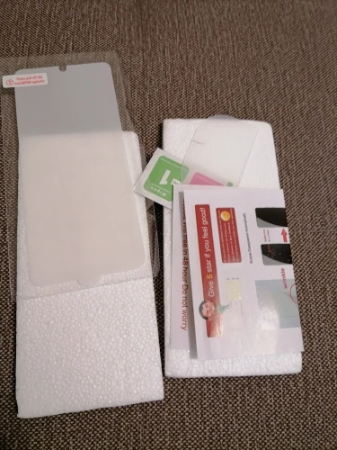 Пленка хорошо упакована между двух кусочков пенопласта. Есть салфетки для подготовки экрана телефона и скребок для приклеивание пленки на телефон без пузырьков и мини инструкция.