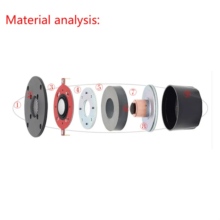 Анализ материала: ①. Черная окрашенная алюминиевая пластина ②. Защитная сетка для звуковой пленки ③. Композитная керамическая звуковая пленка ④. Шайба ⑤ Магнит 70 мм ⑥. Звукопоглощающая полость ⑦. Короткое замыкание медное кольцо ⑧.T железо ⏰. Независимая вибрационная полость Импортная шелковая кромка + высококлассная керамическая композитная пленка не только обладает теплым звучанием шелковой пленки, но и решает общую проблему высоких и сверхнизких и приглушенных звуков. Этот материал обычно появляется на высококлассных твитерах. Метод медного кольца короткого замыкания заключается в размещении медного или алюминиевого кольца короткого замыкания на внешнем диаметре магнитной колонны или внутреннем диаметре магнита. Роль вторичной катушки звуковой катушки, благодаря эффекту короткого замыкания, индуктивность звуковой катушки близка к нулю, А кольцо короткого замыкания делает небольшим изменение нелинейной индуктивности магнитного материала, тем самым уменьшая искажение динамика! Независимая акустическая полость + звукопоглощающий хлопок высокой плотности может эффективно устранить множественные гармоники, генерируемые в звуковой пленке во время высокочастотной вибрации. Второе усиленное усиление проникает в звуковую пленку и распространяется на ухо человека. Чем больше будет слышен звук, тем больше аромата! Прозрачный, четкий, высокая чувствительность, стабильное магнитное поле, уменьшение искажений, улучшение качества звука, устранение нескольких гармонических систем и отсутствие цветовых помех Вес: 0,604 кг Магнитная сталь: 70 мм Размер: 110 мм Звуковая катушка: 25-жильная композитная керамическая мембрана Мощность: 30 Вт-60 Вт Сопротивление постоянного тока: около 6,7 Ом Чувствительность: 94 дБ Частотная характеристика: 1,2 K-22K Посылка: 1 шт.