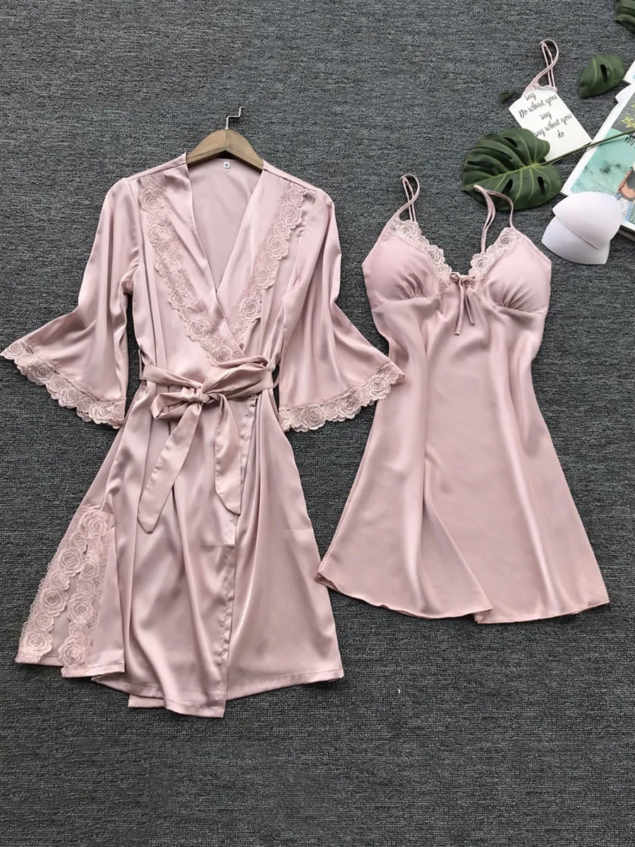 Розовый кружевной халат Женское бельё Пижама комплект из 3 предмето...