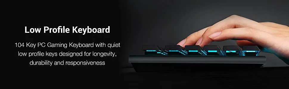Тихая Низкопрофильная Механическая игровая клавиатура; Игровая клавиатура 104 клавиш для ПК с тихими низкопрофильными клавишами, которые обеспечивают долговечность, долговечность и отзывчивость. Клавиатура имеет прочную конструкцию из АБС-пластика с высокоточной конструкцией колпачков. Клавиши клавиатуры обеспечивают механическую клавиатуру с меньшим сопротивлением и коротким перемещением клавиш, они требуют меньше работы и все еще обеспечивают точные тактильные отзывы для безупречной производительности игр