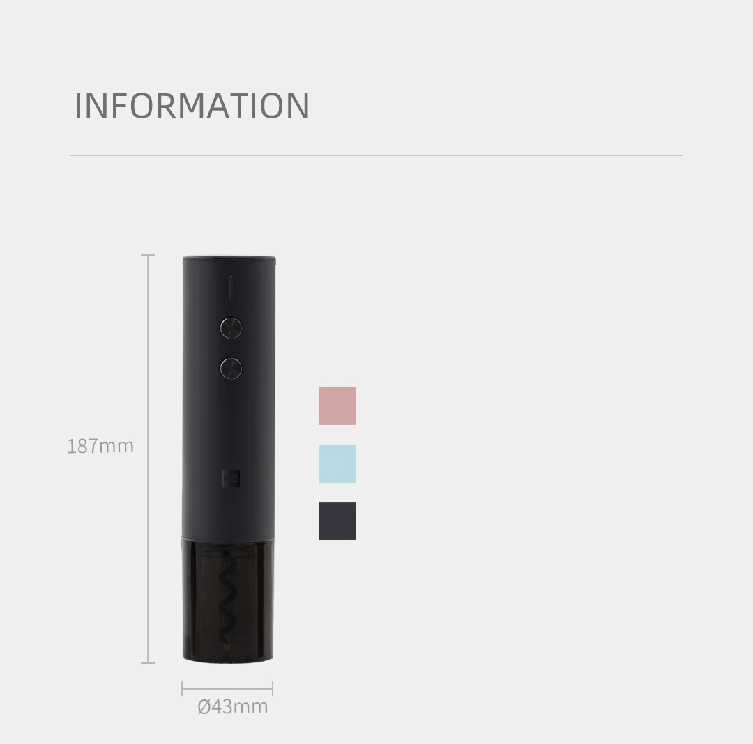 Входное напряжение/мощность: 5 В = 10 ВтЕмкость аккумулятора: аккумулятор 500 мАчМатериал: алюминиевый сплав + пластик PCUSB кабель: Стандартный USB MIC Универсальный интерфейс зарядкиХарактеристики пробки для бутылок: деревянная пробка диаметром 20-24 ммХарактеристики винной бутылки: горлышко бутылки с внешним диаметром ≤ 35 ммШум: менее 56 дБАвтоматическая открывалка для винных бутылок: высотой 187 мм, диаметром 43 ммВес штопор Xiaomi для винных бутылок: 240 г