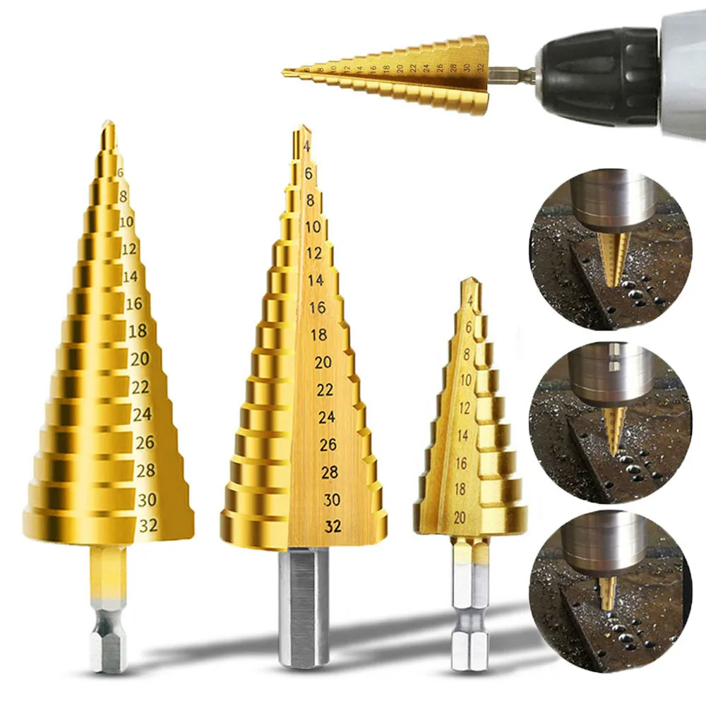3 шт. ступенчатое сверло из быстрорежущей стали с титановым покрытием, 4-12, 4-20, 4-32, для сверления электроинструментов, для металла, высокоскоростное сверло для стали, дерева