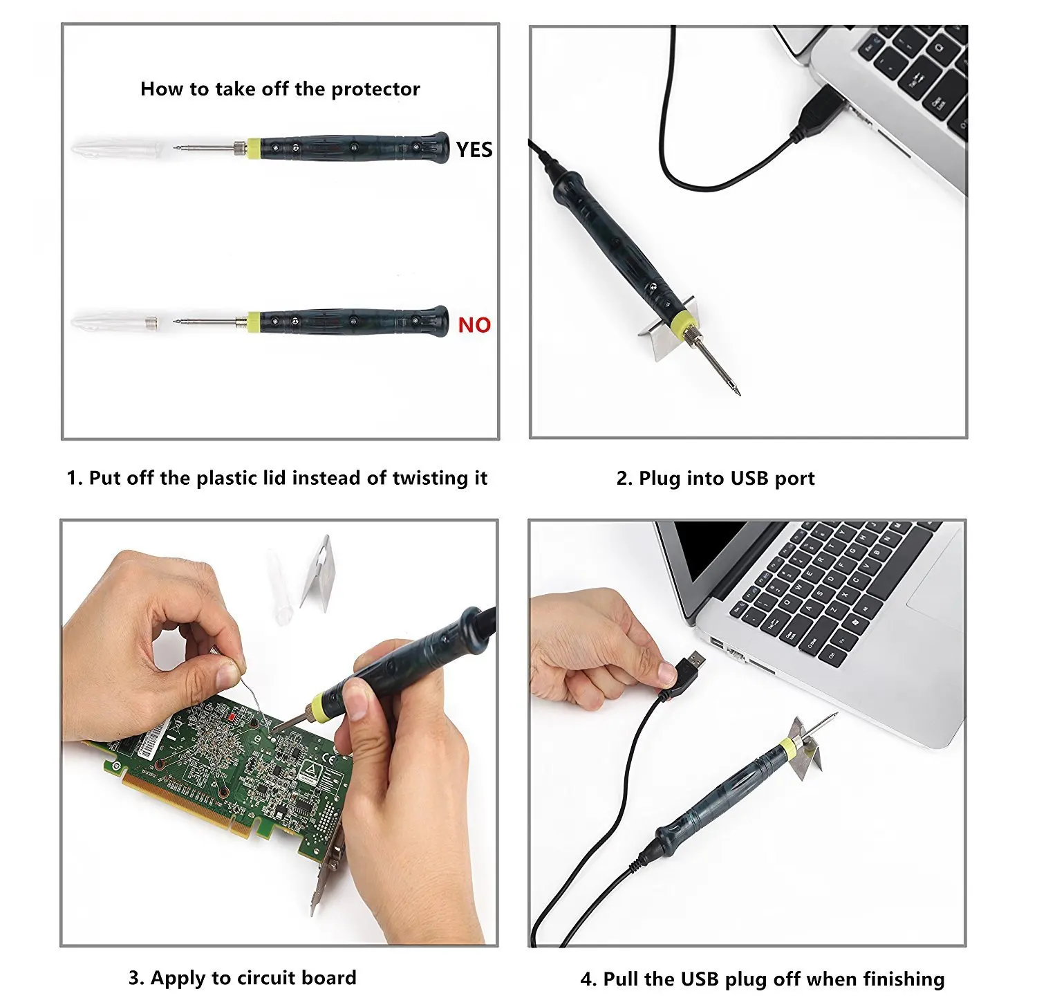 Особенности продуктаПолностью функциональный паяльник с usb-питаниемКомпактный и портативныйВ то время как быстрое потепление и восстановлениеНажмите на металлическую точку снова, чтобы начать работать сноваСочетание нагревательного элемента и сварочной головкиПрикоснитесь к металлическому точки на основной части сварочный электрод мягко, затем светодиодный светильник будет светильник и приступайте к работе.В том случае, если товар находится слева на холостом ходу в течение 15 секунд, светодиодный индикатор светильник погаснут и ручка автоматически перейдет в спящий режим.
