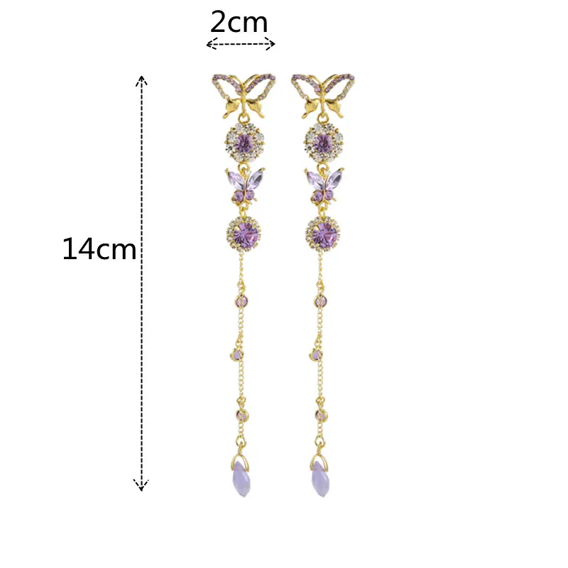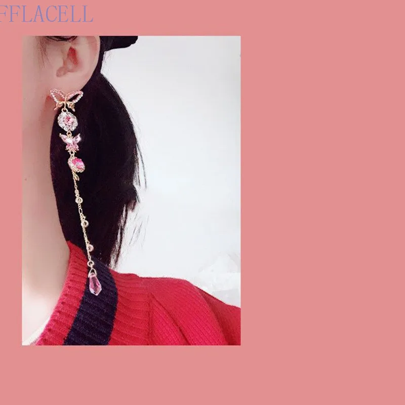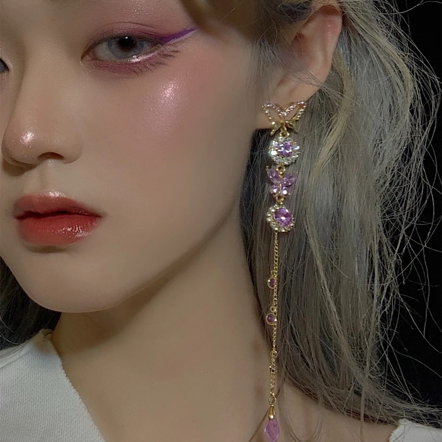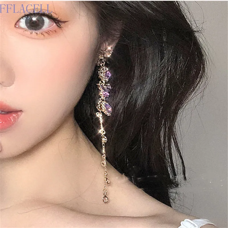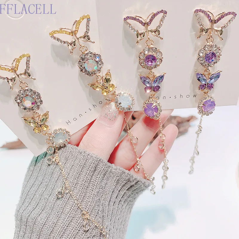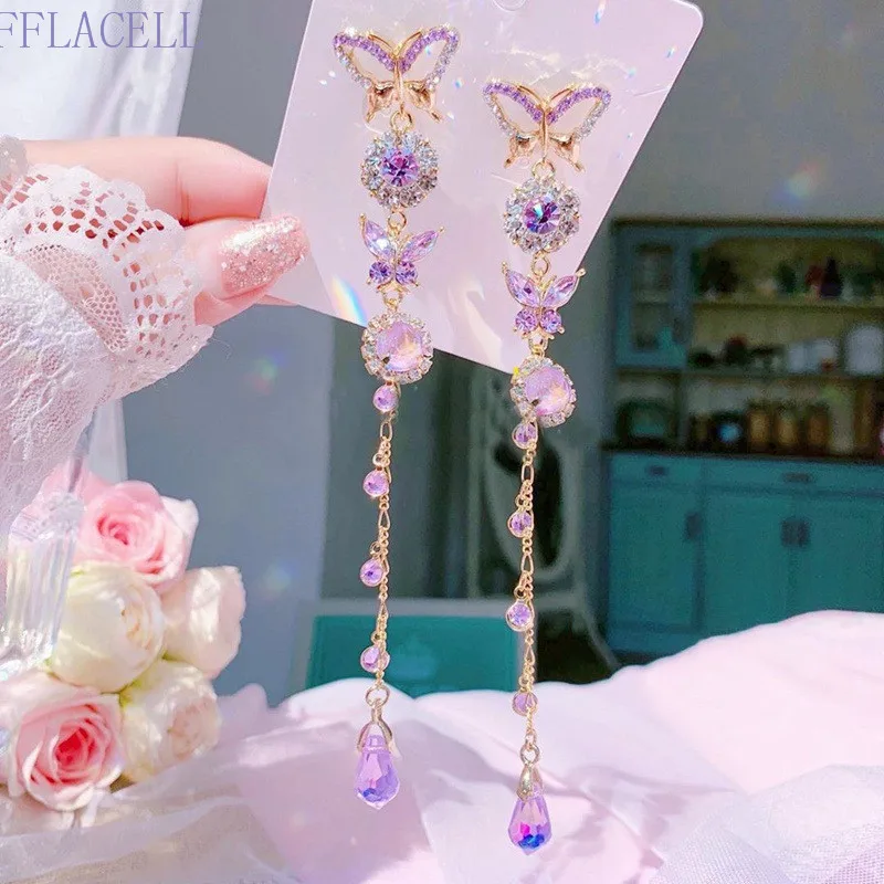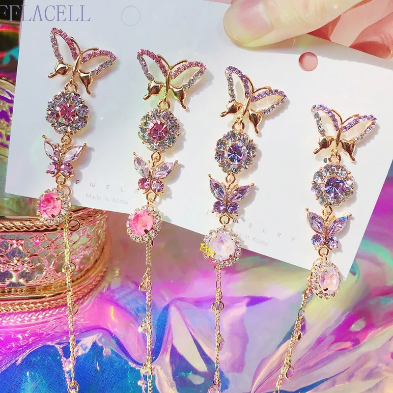 Женские серьги-бабочки FFLACELL, розовые или фиолетовые длинные серьги-бабочки с кристаллами, вечерние серьги для девочек, 2020