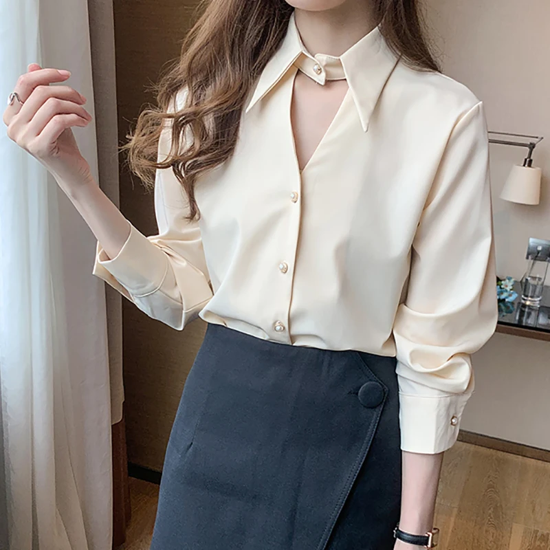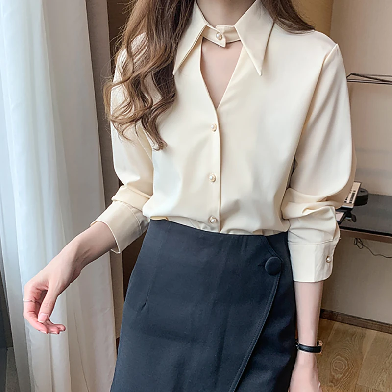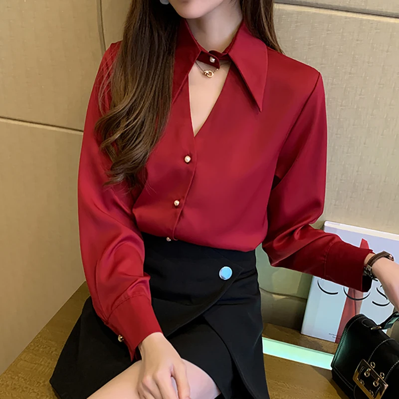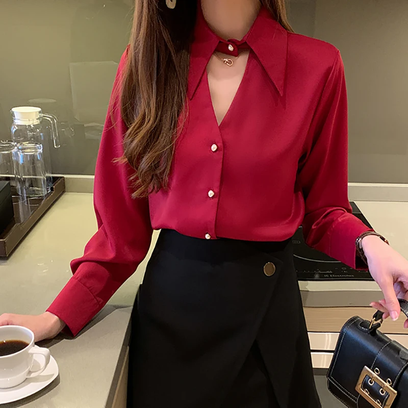 Красная рубашка с отложным воротником и дырками, женская шифоновая блузка с длинным рукавом, новинка 2022, повседневные Осенние Топы на пуговицах, Корейская одежда, женские рубашки