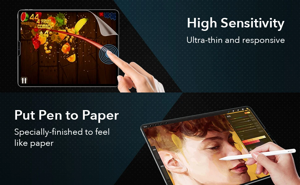 Толщина 0,13 мм обеспечивает высокую чувствительность при использовании карандаша Apple. Специально обработанная поверхность точно имитирует ощущение письма и рисования на бумаге.