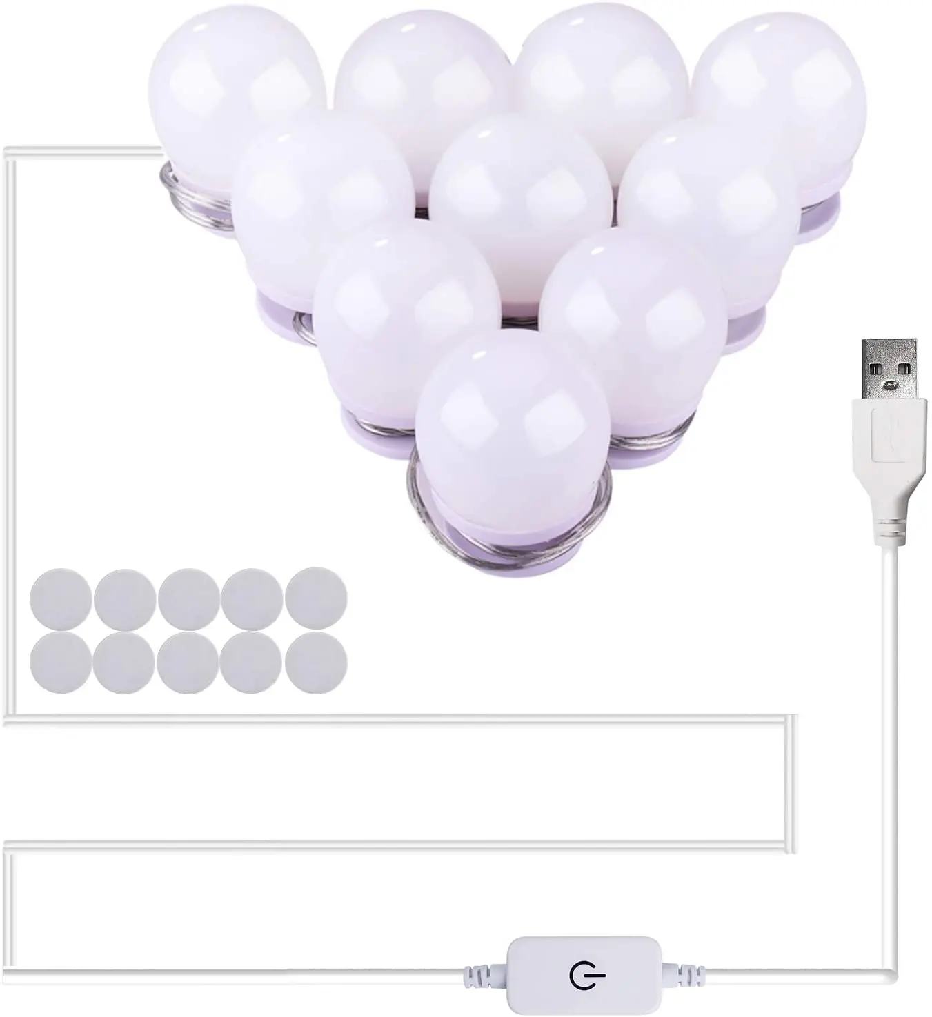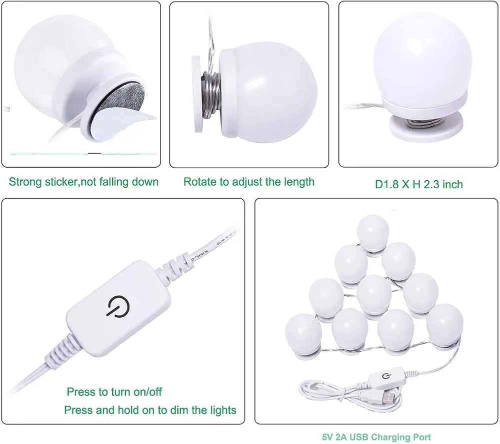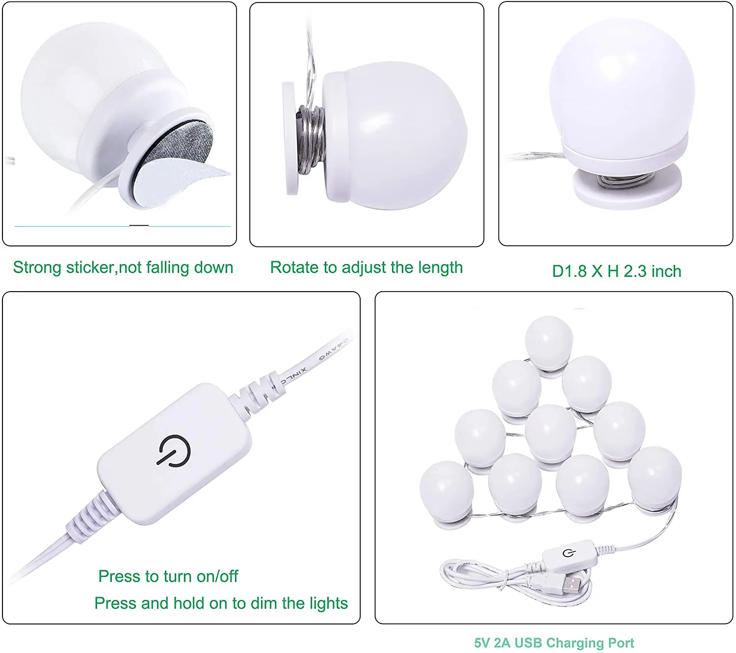 @ CRI:90 + естесветильник свет для макияжа: с естественным белым цветом 4000K и высоким индексом цветопередачи, 10 светодиодных лампочек 5 в обеспечивают достаточный люмен для яркости вашего зеркала. Нет ослепительного света, светильник туалетного столика выглядит мягким, а кожа выглядит более естественной при макияже. @ Простота установки и безопасность в использовании: каждая лампочка для туалетного столика поставляется с двухсторонней лентой. Просто снимите и приклейте к зеркалу, которое вам нравится, а затем подключите USB-порт к внешнему аккумулятору 5 В, зарядному устройству телефона или другому устройству, убедитесь, что вы используете мощность более 2 А. @ Диммируемый: 10 светодиодных ламп могут регулировать яркость с помощью умного сенсорного диммера ВКЛ/ВЫКЛ для удовлетворения ваших различных потребностей при различных обстоятельствах, легко управлять. @ Гибкая длина: Длина 9 футов (без USB-порта и диммера) подходит для большинства зеркал, дизайн с регулируемыми шнурами предлагает различные требования, дополнительные провода можно легко обернуть и спрятать, чтобы ваш туалетный столик был чистым. @ Vanity lights stick on: благодаря надежной двусторонней ленте высокого качества зеркальные светильники будут плотно прикреплены. Наклейки 20шт в качестве резервного копирования в чехол для перемещения световых комплектов vanity светильник новое место.