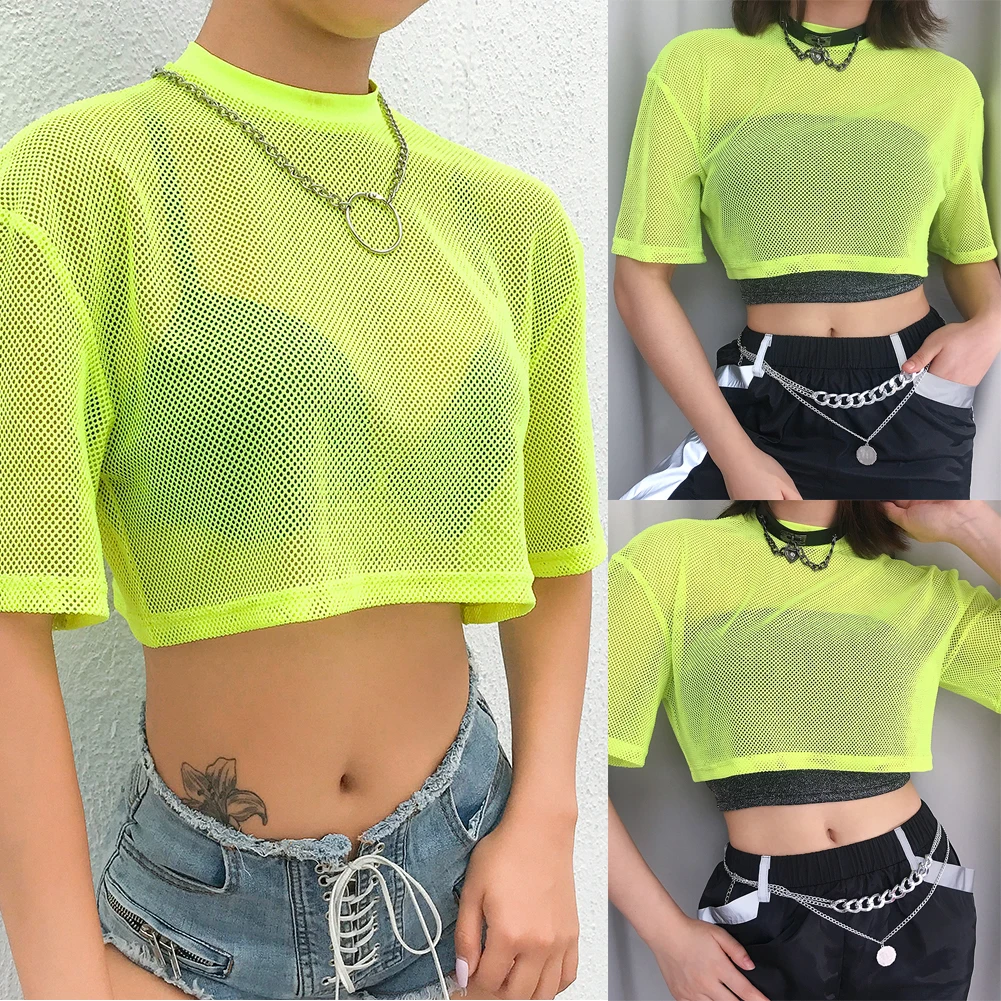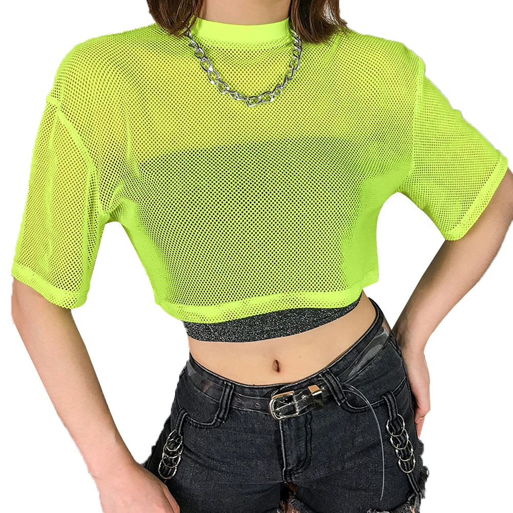 Женский ярко-зеленый сетчатый укороченный топ, сетчатая прозрачная Укороченная рубашка с короткими рукавами, свободная футболка, Женская Клубная одежда, лето, хит продаж