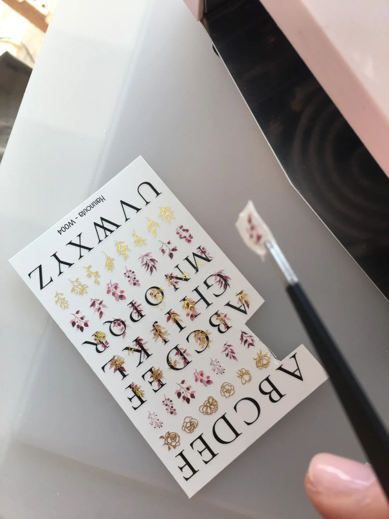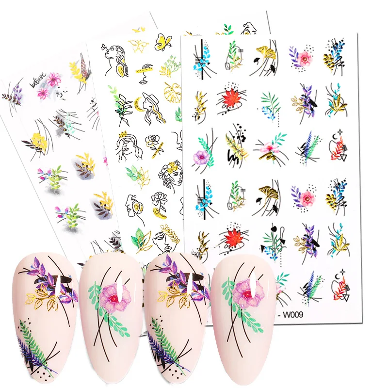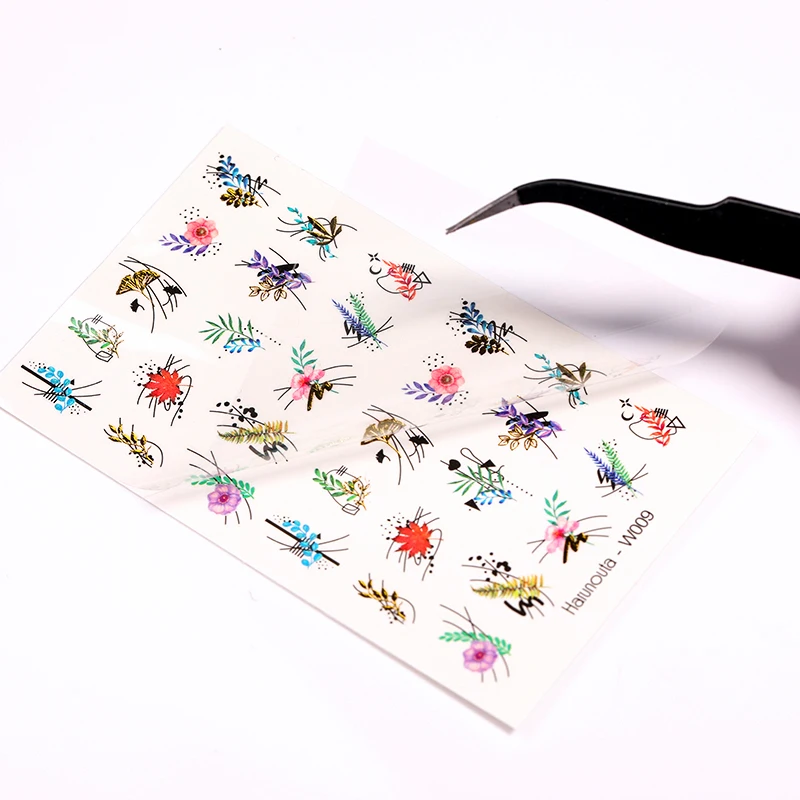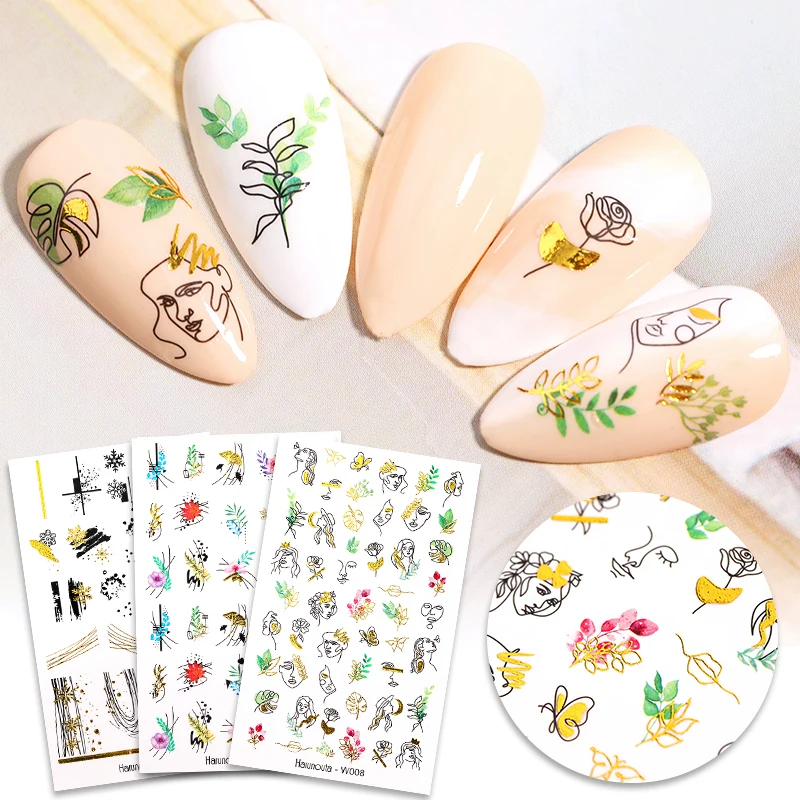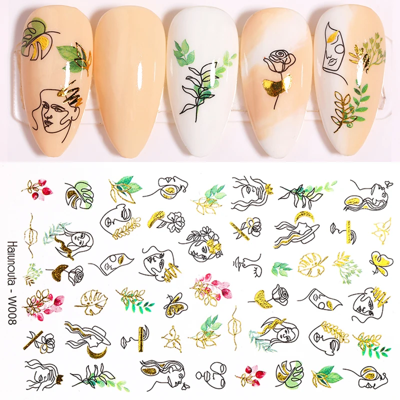 Наклейки для ногтей, 1 лист, с весенней водой, золотые, бронзовые, цветочные, с листьями, абстрактные, с человеческим лицом, фольга для ногтей, для маникюра