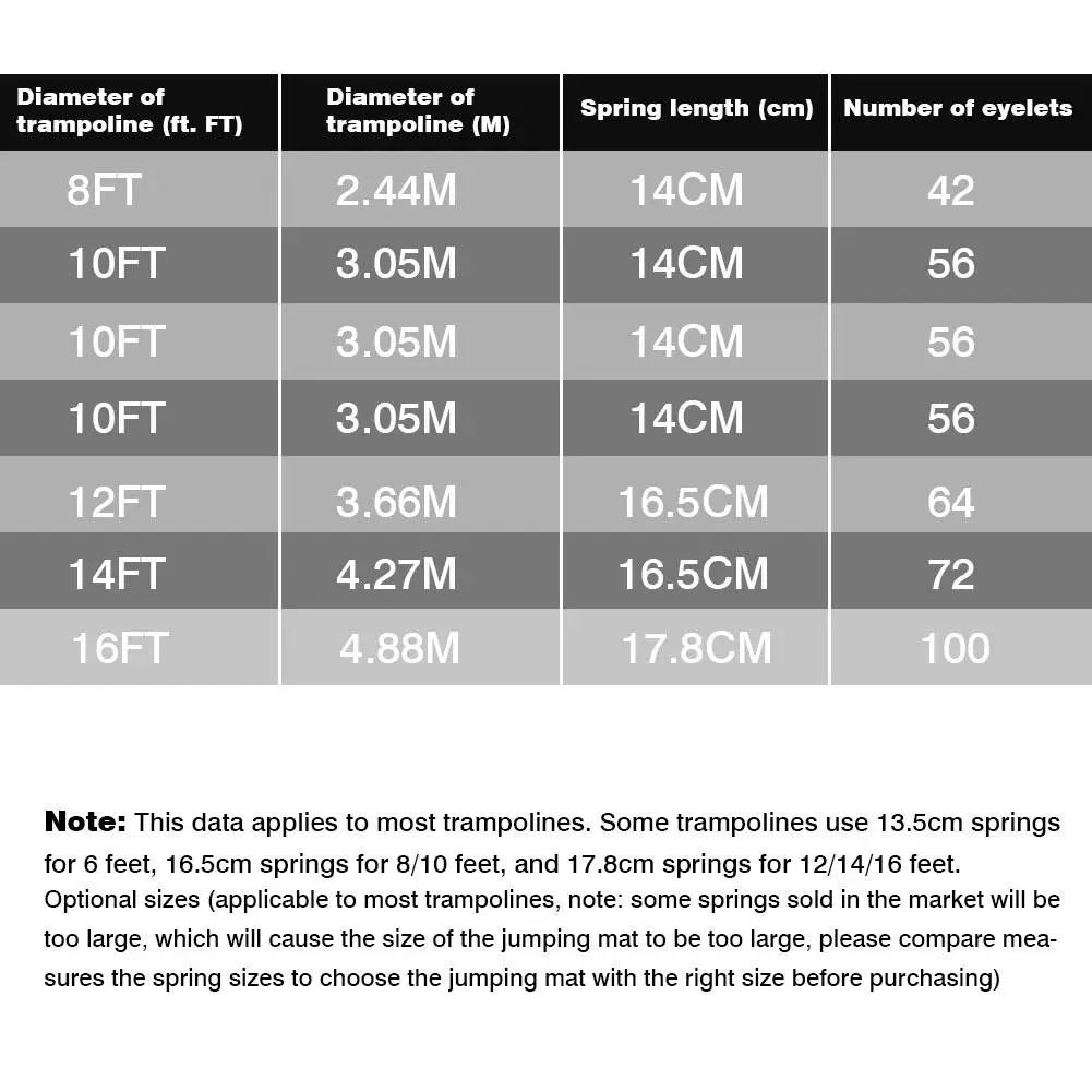 1. Сверхмощный материал: коврик для прыжков на батуте изготовлен из сверхмощного полипропиленового сетчатого материала премиум класса и имеет 8 рядов вышивки, что обеспечивает дополнительную безопасность, это предотвращает обучение коврику и гарантирует удовольствие в течение многих лет.2. Устойчивость к ультрафиолетовому излучению: коврик для прыжков на батуте является УФ-стойким, водонепроницаемым и выцветающим ковриком.3. Прочный и прочный: коврик для прыжков на батуте-это прочный коврик для прыжков на батуте. И он крепится с помощью 8-кратный шитья, и в нем есть прочные металлические люверсы. И он был пришит 8 раз, пошив по часовой стрелке 4 раза, пошив против часовой стрелки 4 раза, поэтому коврик прочный и прочный.4. Маленький Наконечник: Сменные коврики подходят только для батутов с одинаковым диаметром, длиной пружины и количеством пружин.5. Несколько целей: сменный батут для прыжков используется для сада и двора.Особенности:Хорошее качество изготовления и отскок дарят приятные ощущения при прыжках. Оптимальная посадка дает необходимое напряжение для бесконечного удовольствия от прыжков. Легко собирается.Количество люверсов и диаметр коврика для прыжков должны соответствовать хорошей мощности прыжков. Пожалуйста, установите коврик для прыжков в соответствии с инструкциями.Характеристики (о):Название: батут сеткаЛюверсы: пришиты 8 разМатериал: полипропиленовая сеткаПреимущество: проницаемый для водыЦвет: черныйРазмеры:Коврик для прыжков диаметром 8 футов/2,44 м (42 люверса)Коврик для прыжков диаметром 10 футов/3,05 м (56 люверсов)Коврик для прыжков диаметром 12 футов/3,66 м (64 люверса)Коврик для прыжков диаметром 14 футов/4,27 м (72 люверса)Коврик для прыжков диаметром 16 футов/4,88 м (100 люверсов)Упаковочный лист:Коврик для прыжков на батуте * 1 (содержит люверсы для легкой установки и удаления)
