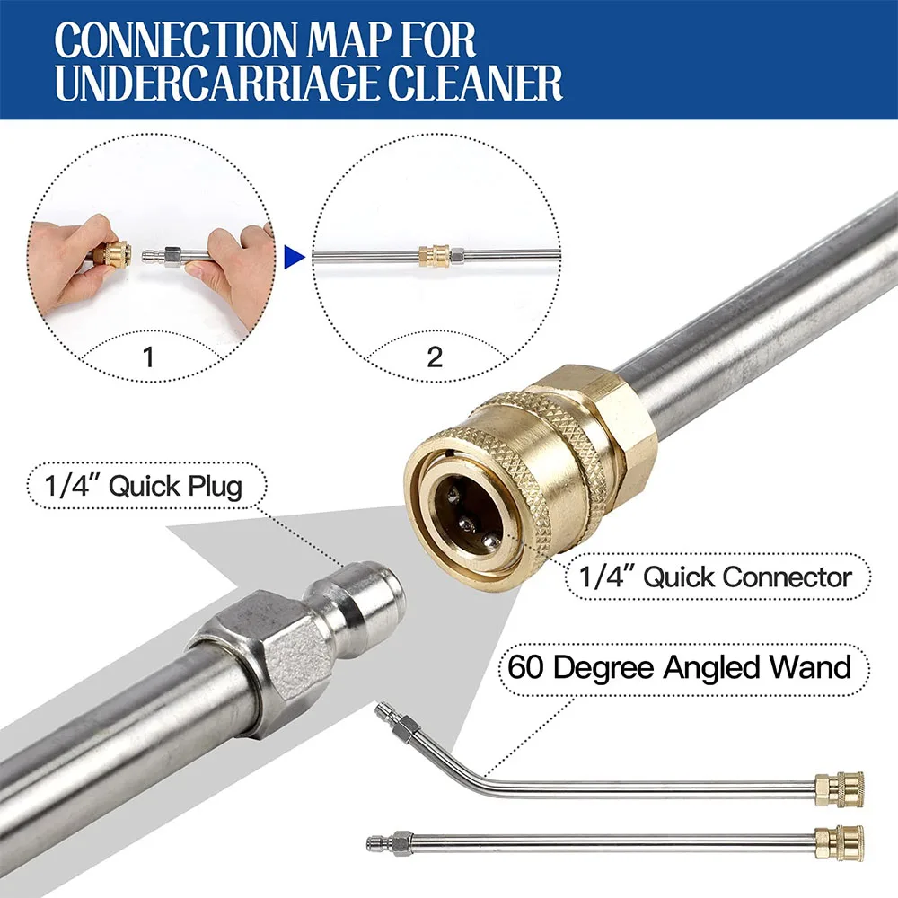 [Легко установить автомобиль под мойкой] Мойка под давлением очиститель ходовой части 1/4 "штекер для быстрого подключения и выпуска. Очиститель мойки работает при подключении к удлинительной палочке мойки высокого давления. Было бы удобнее, если бы вы соединили поворотную муфту между пылесосом undercarraige и палочкой.
