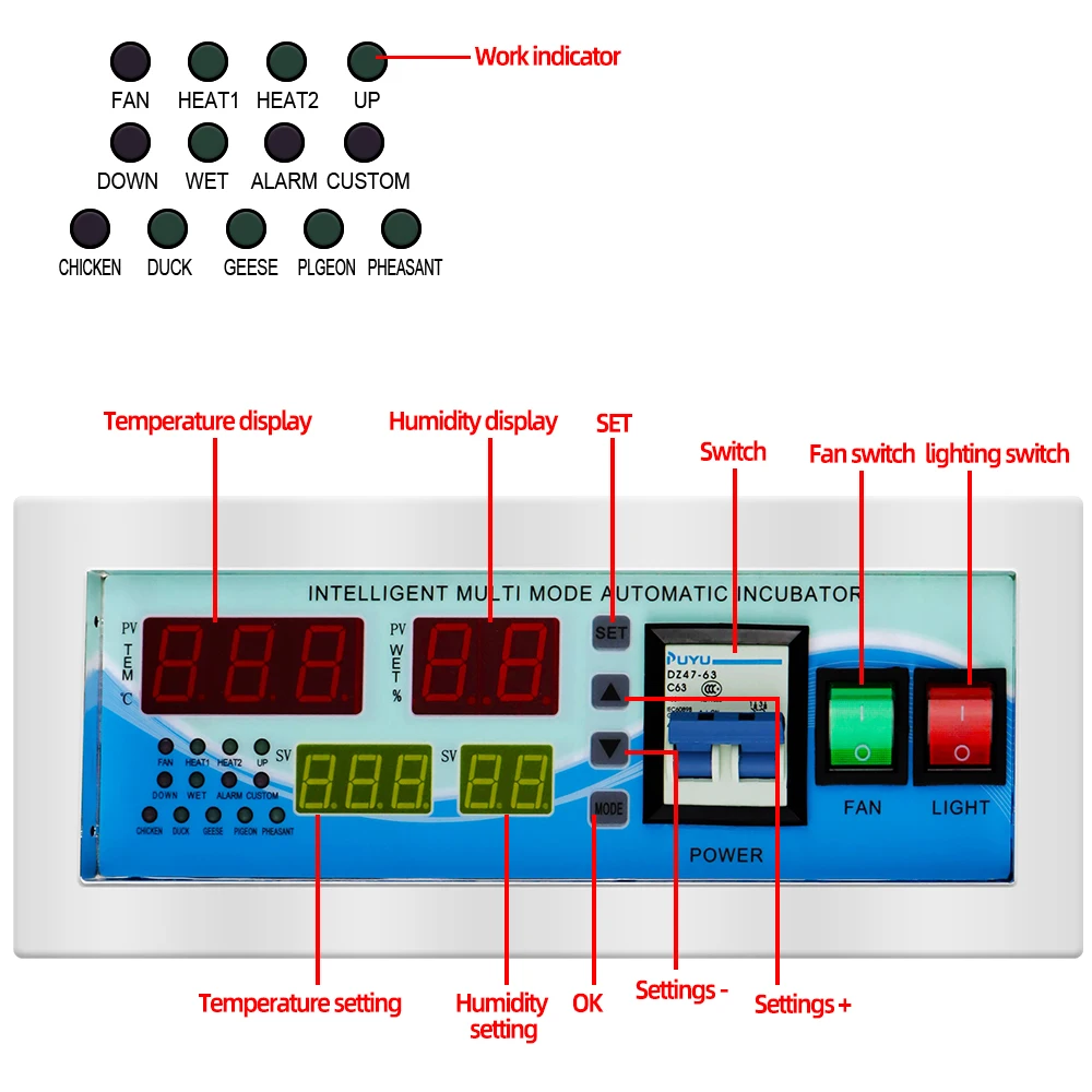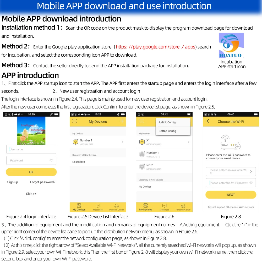 WiFi удаленный Интеллектуальный инкубационный контроллер-это новое поколение микрокомпьютерной системы управления с дистанционным управлением на мобильный телефон и мониторингом в реальном времени, разработанным и разработанным нашей компанией для инкубационной промышленности. Он разработан в очеловеченном полноцветном режиме экрана, красивый и яркий В то же время, есть: обычай, курица, утка, гусь, голубь, пять режимов инкубации для пользователей, чтобы выбрать свободно, используя новейшие технологии микроэлектроники и новые компоненты. Микрокомпьютерный чип обладает сильной защитой от помех и высокой стабильностью работы. Датчик температуры оснащен высокоточным датчиком и высокоточным датчиком температуры; Высокоэффективный датчик влажности выбирается с высокой точностью для эффективного обеспечения стабильности и надежности производительности продукта.