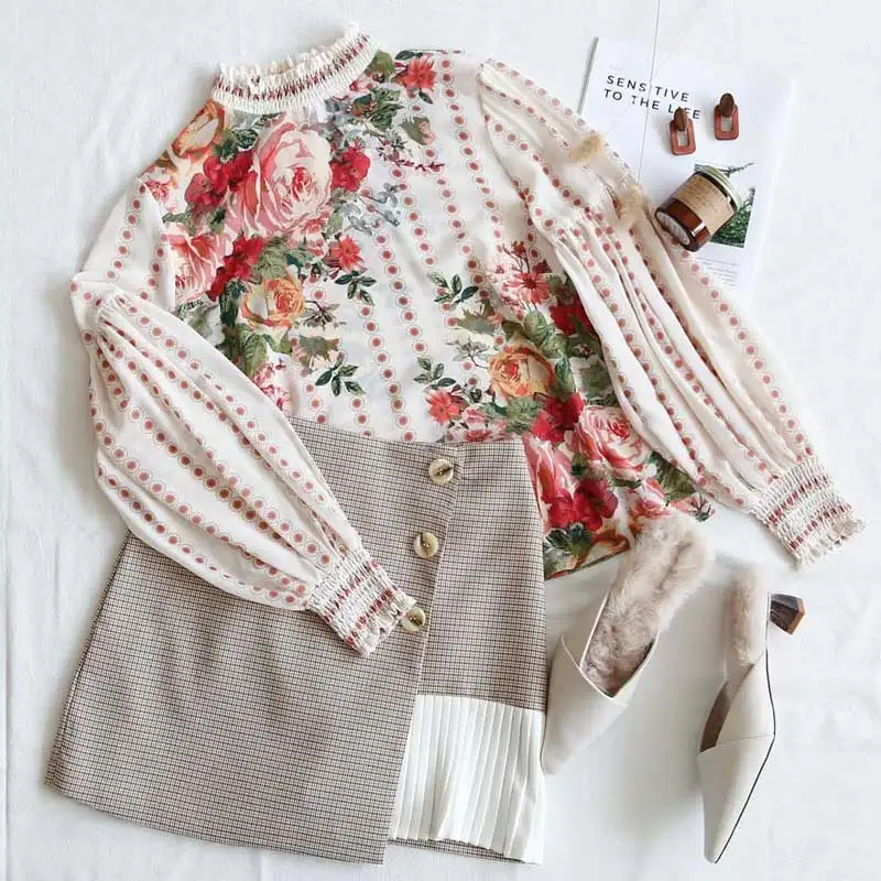 Женская шифоновая блузка с длинным рукавом, круглым вырезом и цветочным принтом