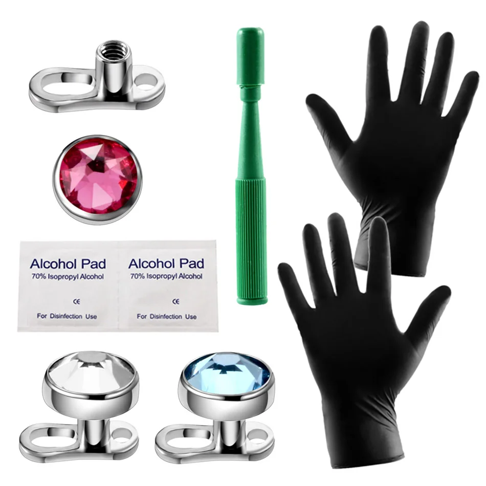 Перчатки не были упакованы индивидуально, поэтому они не были стерильными, и зеленый инструмент не поможет проколоть кожу или разместить якорь во время процесса пирсинга, мне пришлось получить иглу отдельно от комплекта чтобы сделать кожный пирсинг