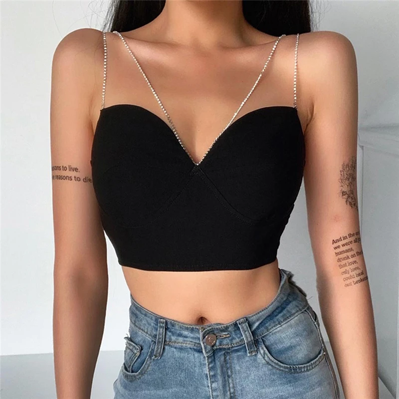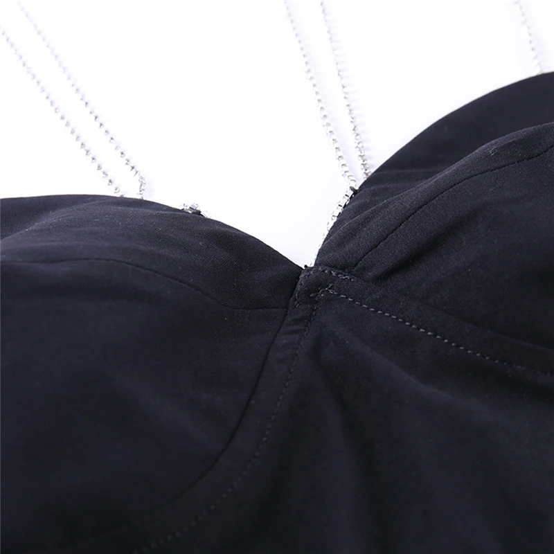 УКОРОЧЕННЫЙ ТОП стразы на бретельках с цепочками, женский сексуальн...