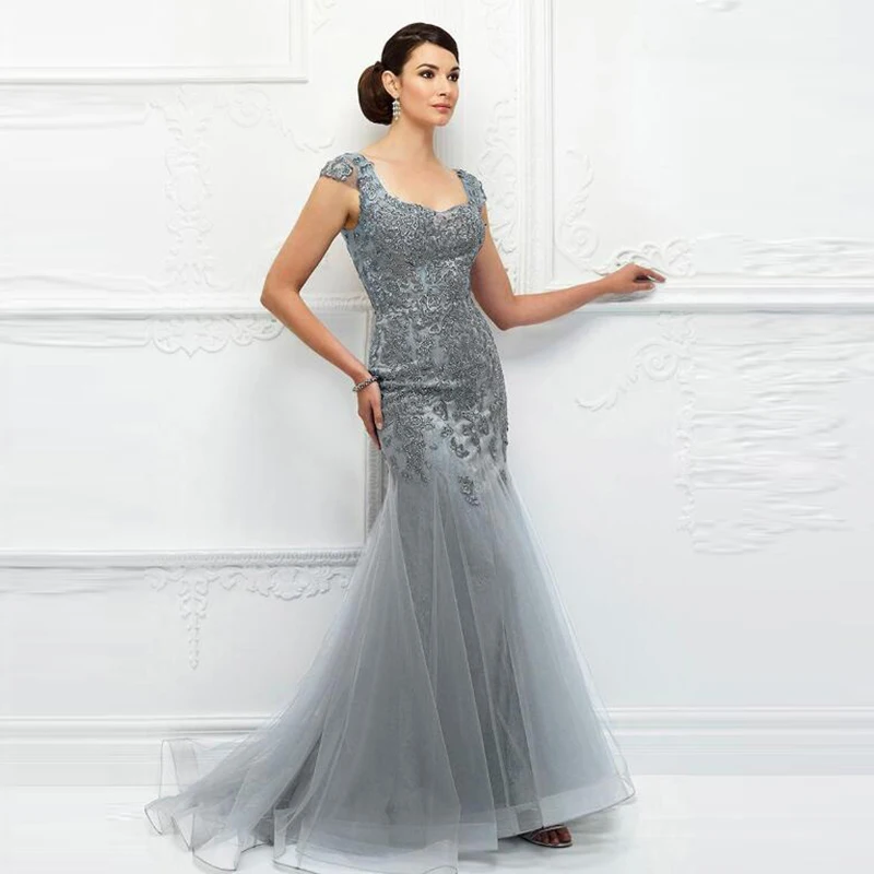 Серое кружевное платье русалки с круглым вырезом для матери невесты...