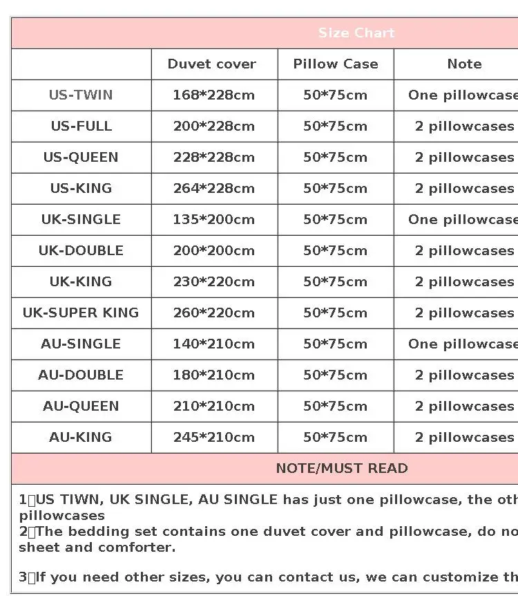 Упаковочный лист: 1 * пододеяльник + 2 * наволочки (AU Single / UK Single / US Twin only 1 Наволочка)