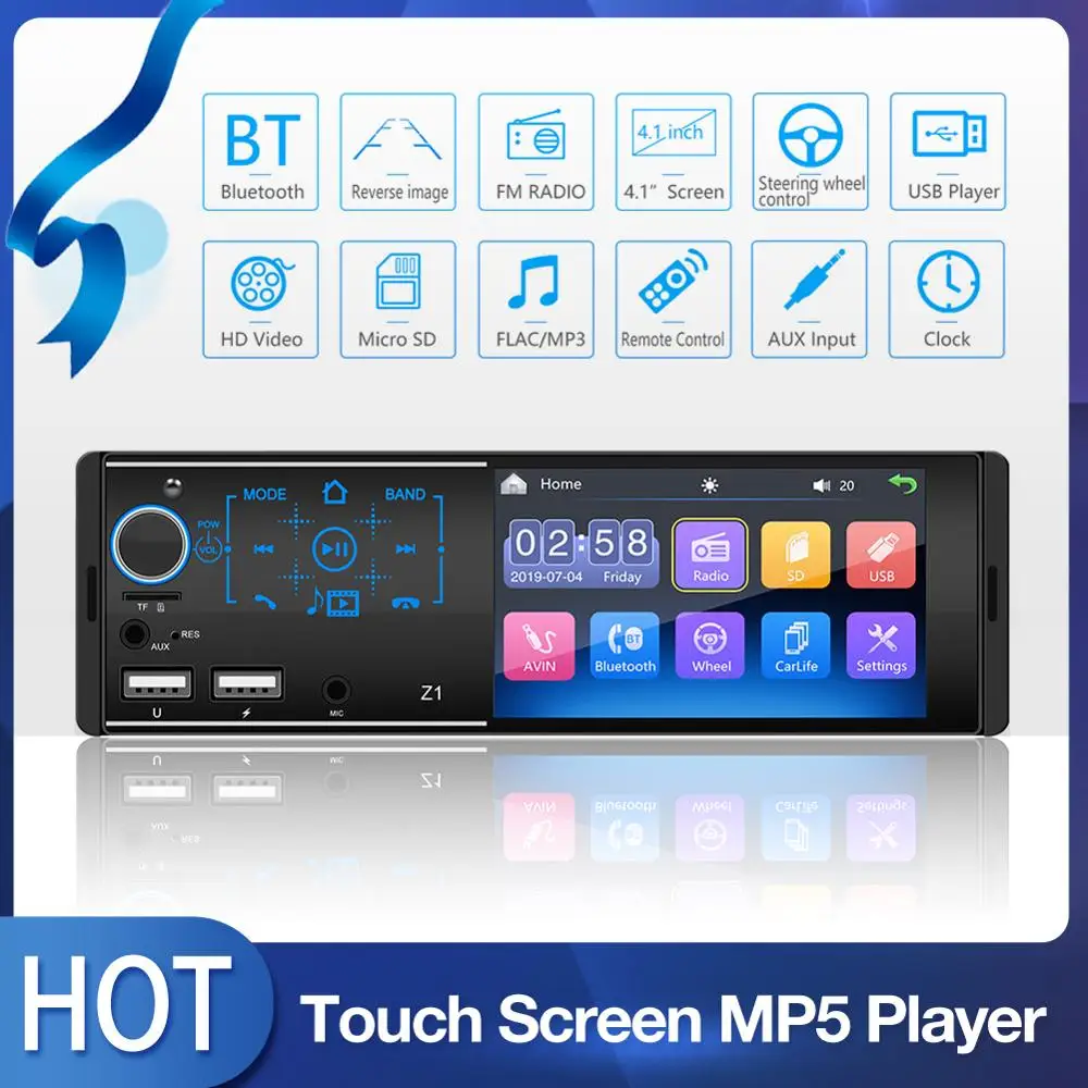 1Din автомобильный MP5 плеер 1080P HD видео автомобильный стерео AM радио приемник 4,1 ''TFT сенсорный экран Поддержка Bluetooth Aux-inUSBFM и камеры