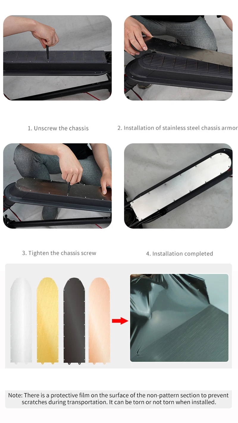 Пластина качественная, подходит на ninebot g30p pro max. Все посадочные места для винтов подошли, все закрутилось. Аккуратнее с острыми краями пластины - может быть их стоит напильником стесать, чтобы не поцарапаться или не порвать одежду. Винты в комплекте с толстыми головками, выпирают над поверхностью - чаще будете задевать перепады высоты на лестницах. Хорошая защита днища. Упаковано качественно, пришла за полторы недели в Москву. Рекомендую.