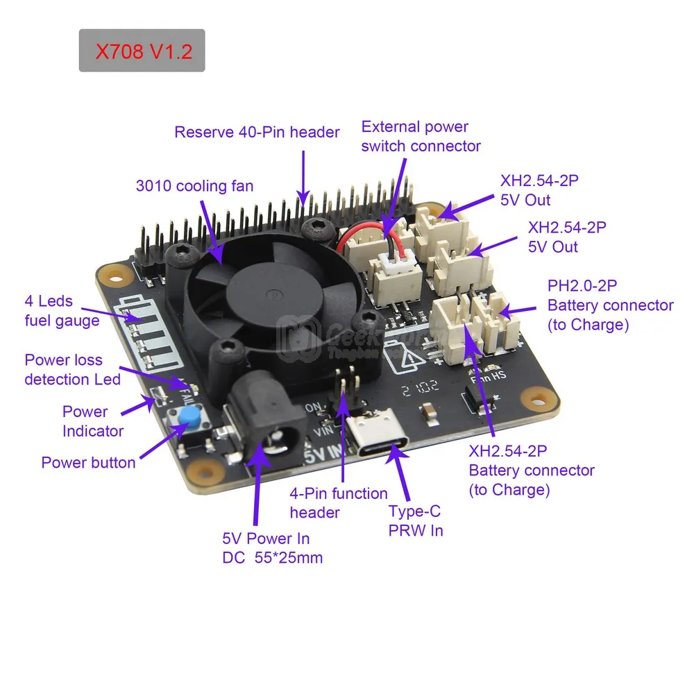 В X708 является передовым источник бесперебойного электроснабжения от источника питания плата расширения для всех текущих моделей Raspberry Pi с помощью 40 штыревой разъём. Он обеспечивает5,1 V Макс. 8000mAРезервное копирование питания даже для самых требовательных наборов Raspberry Pi,Интеллектуальное и безопасное управление питанием,Безопасное отключение,Автоматическое включение,Полная мощность от программного обеспеченияИВентилятор охлаждения.