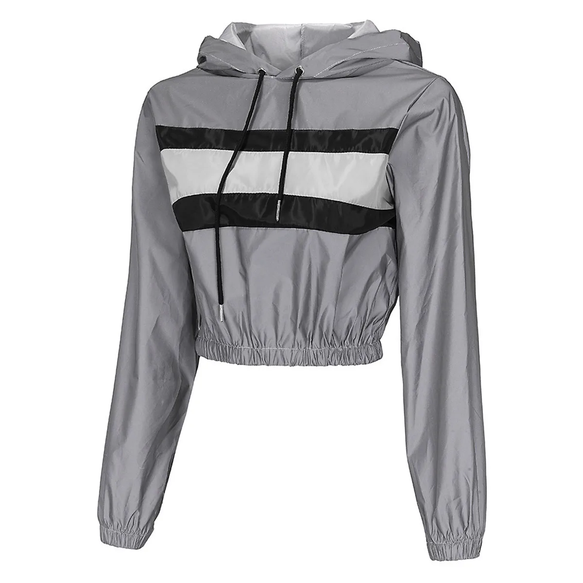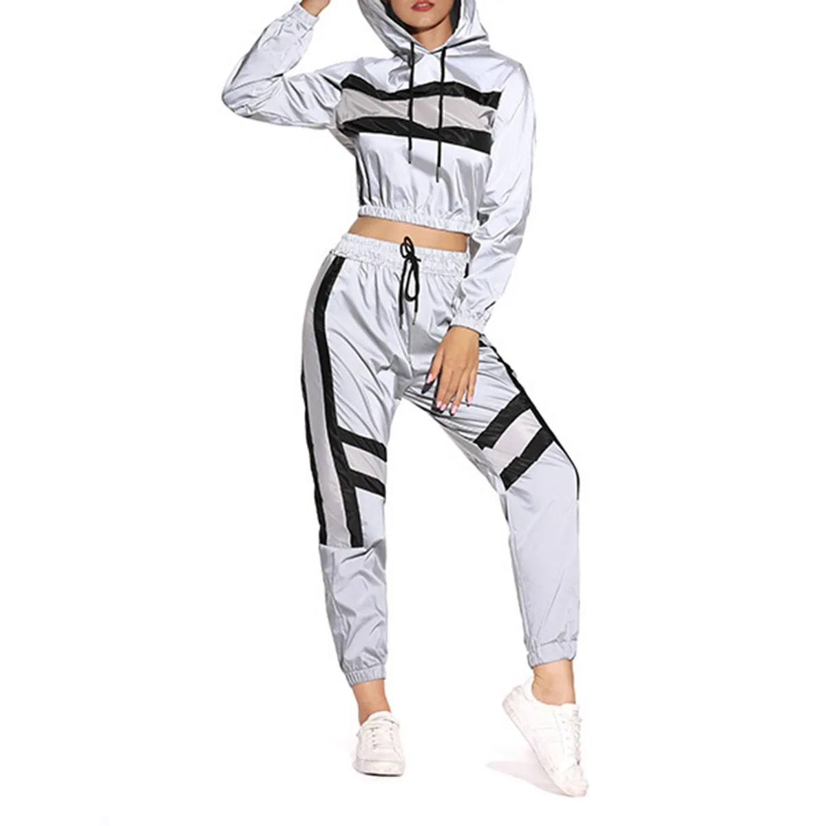 Женский Светоотражающий Комплект из 2 предметов, привлекательный укороченный топ с капюшоном и брюки с эластичным поясом, спортивный костюм, комплект