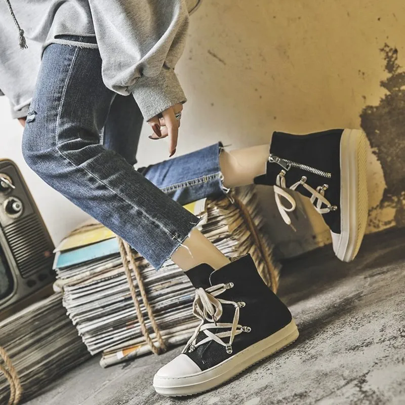 Парусиновая обувь с высоким берцем; Женская новая кожаная парусиновая повседневная обувь на толстой подошве; Модные кроссовки; Большие размеры; Tenis Feminino