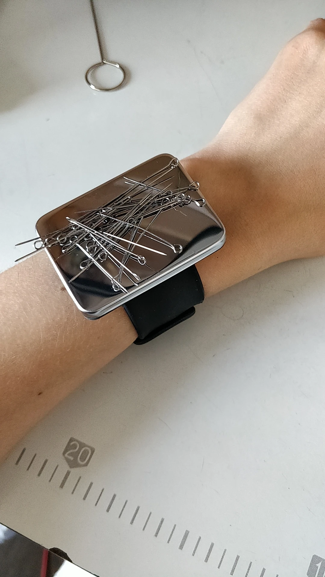 Посылку доставили через 3,5 недели, обьединили с другими заказами. Классная игольница, аккуратная, на узкое запястье подошла отлично, не крутится. Хорошо примагничивает даже толстенькие булавки.