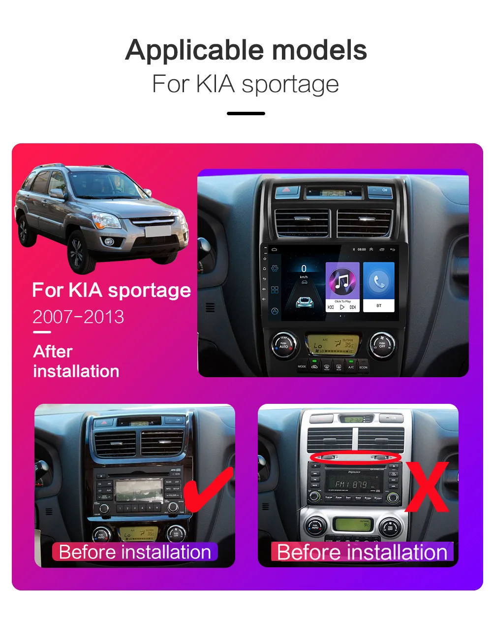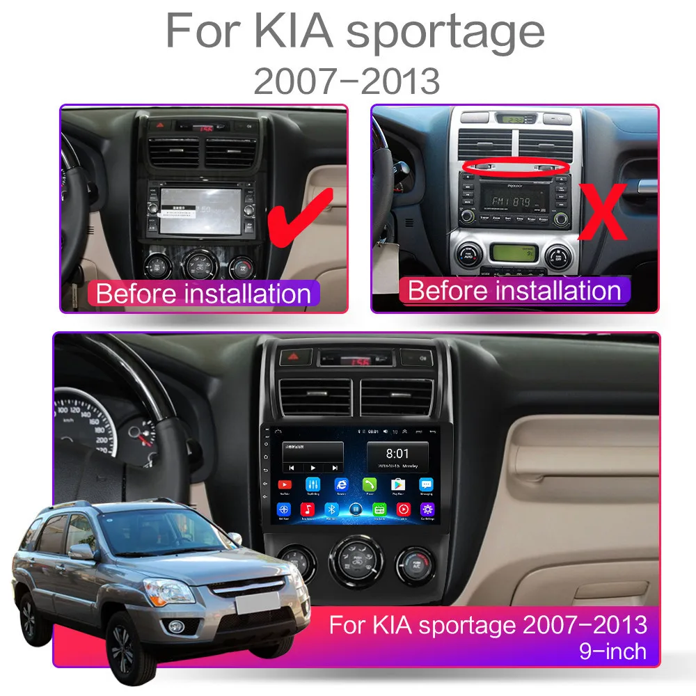 Для Kia Sportage 2 2007 2008 2009 2010 2011 2012 2013 1, 4-ядерная конфигурация включает (RAM + ROM): 1G + 16G / 2G + 16G / 2G + 32G / 4G-SIM-3560-2G + 32G [опционально]; 2, 8-ядерная конфигурация включает (RAM + ROM): 7260L-2G + 32G / 7260L-4G + 64G / 4G-SIM-5760-2G + 32G / 4G-SIM-5760-4G + 64G / 4G-SIM-TS10-4G + 64G / 4G-SIM-TS10-6G + 128G [опционально]; 3, 4-ядерный содержит: версию: Android 8,1; Четырехъядерный процессор MTK8227 / Cortex-A7 Поддержка логотипа автомобиля 5; Заводской пароль: 8888 Разрешение: HD 2.5D,1024*600; Не поддерживает функцию AM, RDS; Обыпосылка пакет версии Wi-Fi поддерживает функцию вывода видео; Версия 3560-4G-SIM-WiFi: версия: Android 6,0; Поддерживает DSP; Не поддерживает функцию вывода видео; 4, 8-ядерный содержит: версию: Android 9,0 или Android 10; Восемь ядер: CPU Quad core и GPU Quad core соответственно; Поддержка логотипа автомобиля 5; Пароль завода: 8888; Разрешение: HD 2.5D,1024*600; Версия 7260L-WIFI: поддерживает функции DSP, разделения экрана; Не поддерживает выход видео; Версия 4G-SIM-5760-WIFI и 4G-SIM-TS10-WIFI: поддерживает функции DSP, Carplay, разделенного экрана, слота для SIM-карты 4G; Не поддерживает видеовыход; 5. Операционная система Android может установить приложение Google Play store Skype Facebook youTube Twitter и т. д.; 6. Поддержка: радиостанции, звонков по Bluetooth, музыки по Bluetooth, управления рулевым колесом, встроенного Wi-Fi, MP3, видео-музыки (MPG, AVI), навигации, видеовыхода, зеркальной связи, USB 4G LTE Wi-Fi ключ и другие функции; Поддержка OBD (опционально) Поддержка DAB + (опционально)