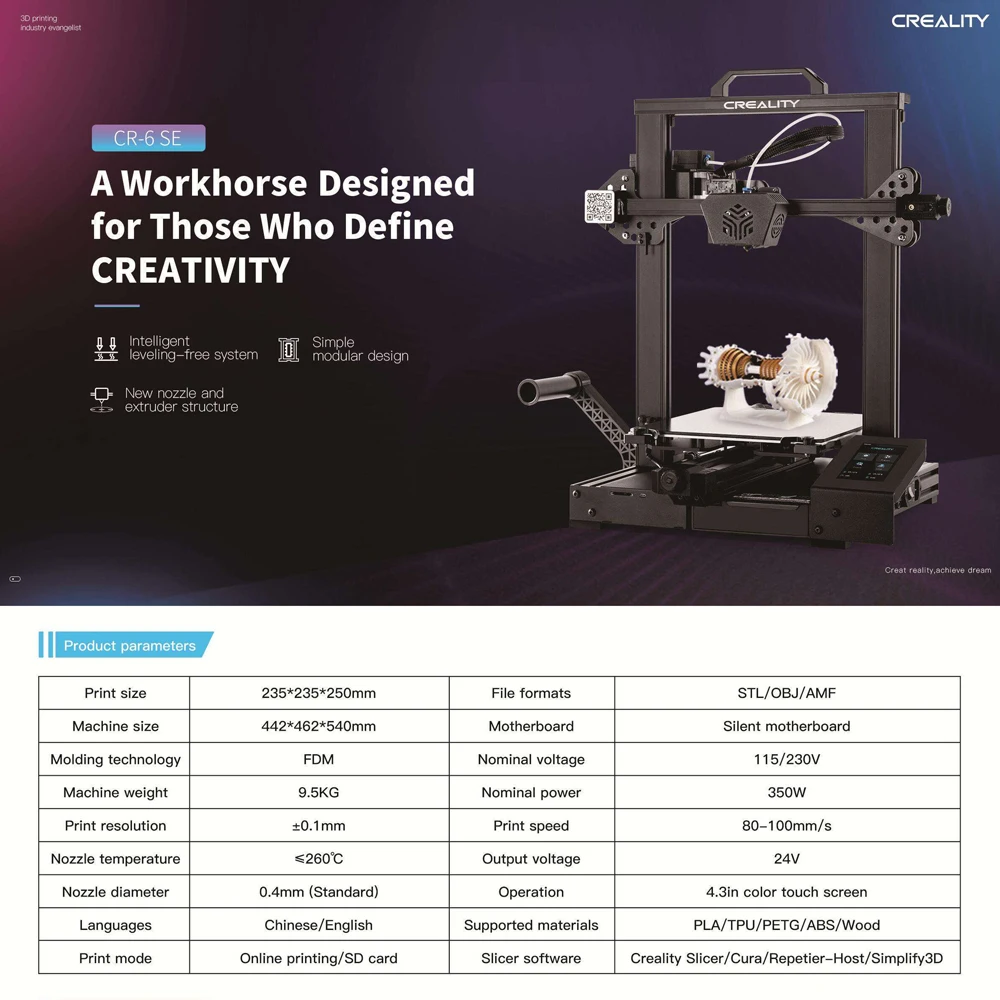 Особенности:Настольный 3D принтер:CR-6 SE 3D-принтеры комплект, 235*235*250 мм размер печати, с 4,3 дюйма цветная hd-камера заднего вида с сенсорным экраном. Запатентованная система без выравнивания предназначена для действительно достижения беспроблемного и интеллектуального автоматического выравнивания платформы.Стабильная ось Z и ремень ГРМ:Большая стабильность и баланс обеспечивается двойной z-осью и зубчатой лентой, снижая вибрации на оси Z и достигая плавного движения и точных результатов.Инновационная конструкция сопла:Литьевая насадка и экструдер переработаны с модернизированным теплоотводом, тепловым блоком, что значительно повышает эффективность нагрева и охлаждения.Мощная функция:Поддержка отключения питания повторная печать и обнаружение сломанной нити, принтер возобновит печать в точке останова после выключения питания, значительно улучшает скорость успеха модели печати.Бесшумная материнская плата и платформа Carborundum:Оснащенная самостоятельно разработанной бесшумной материнской платой, CR-6 SE способна управлять напряжением, плавным движением и бесшумной печатью. Карборунд hotbed с отличной тепловой производительностью способствует быстрому нагреванию, Сильной адгезии и легкому удалению для принтов.Широкая совместимость и применение:Совместимость с различными 1,75 мм печатными нитями, такими как PLA, ABS, TPU, дерево и т. д.; Широко используется в домашнем украшении, игрушках, аниме ремеслах, обучении, медицине и т. д.Характеристики:Бренд: CREALITYМодель: CR-6 SEМатериал оправы: алюминиевый сплавТехнология формования: FDMРабота: 4.3 дюйма цветной сенсорный экранРазмер печати: 235*235*250 ммСкорость печати: 80-100 мм/сек.Принт постановления: ± 0,1 ммТемпература сопла: ≤ 260 ℃Сопло Диаметр: 0,4 мм (Стандартный)Языки: китайский/английскийРежим печати: онлайн Печать/sd-картаФормат файла: STL/OBJ/AMFПоддерживаемый материал: PLA/TPU/PETG/ABS/деревоПрограммное обеспечение для резки: слайсер Creality/Cura/Repetier-Host/Simplify3DМатеринская плата: Бесшумная материнская платаПитание Световой поток: Вход 115V/230V, Выход: 24VНоминальная мощность: 350 ВтРазмер машины: 44,2*46,2*54 см/17,4*18,2*21,3 дюймаМашина Вес: 9,5 кг/20.9lbПосылка Размеры: 52*50*26,5 см/20,5*19,7 * 10.4inПосылка Вес: 13,5 кг/29.8lbУпаковочный лист:Набор 3D-принтеров + 8G sd-карта + 200G PLA образцовая нить