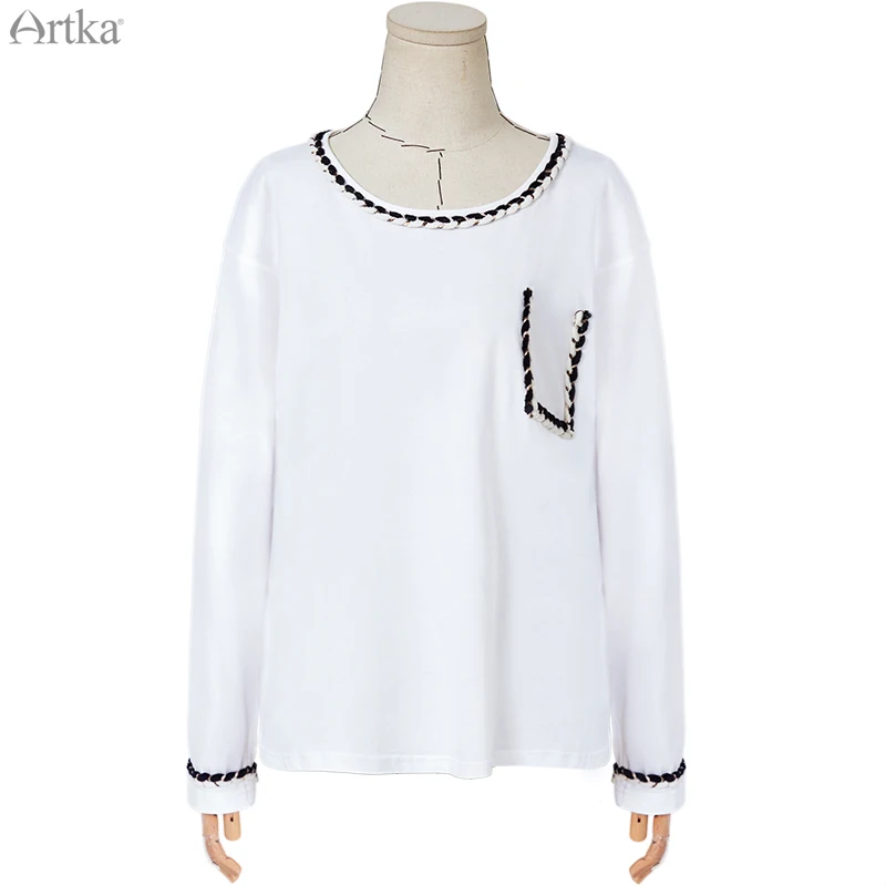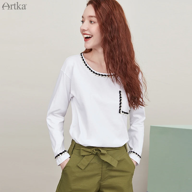 Женская футболка из чистого хлопка ARTKA, белая футболка с длинным рукавом и круглым вырезом, TA25005Q, на раннюю осень 2020