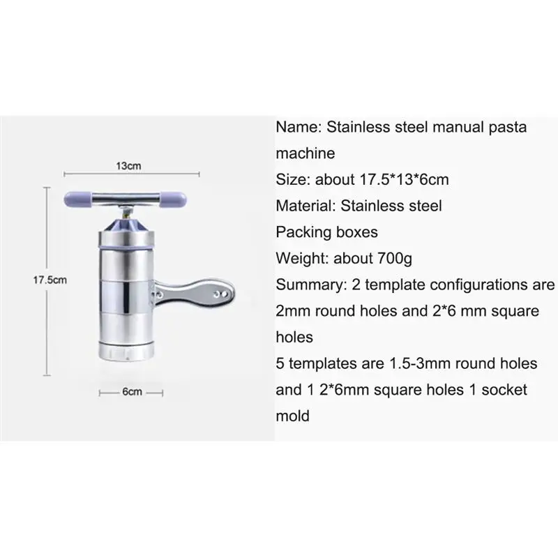 Особенности: Материал высокого качества Эта кухонная ручная машина для приготовления лапши изготовлена из высококачественной нержавеющей стали, безопасна, прочна и устойчива к ржавчине в использовании. Выбираемые головки форм Эта машинка поставляется с 2 или 5 головками форм, поэтому вы можете выбрать разные головки форм для изготовления лапши разной толщины. Многофункциональный Это не просто аппарат для приготовления лапши, он может использоваться как соковыжималка для фруктов для извлечения сока, идеально подходит для использования на кухне. Эргономичный дизайн Рокер винтового пропеллера экономит усилия, а ручка из нержавеющей стали удобна в использовании. Портативный Эта макароноварка небольшая и портативная, подходит не только для домашнего использования, но и ее легко брать с собой куда угодно. Области применения Эта лапша-хороший помощник на кухне, подходит для приготовления различной лапши и выдавливания сока, может использоваться дома, в ресторанах, на открытом воздухе, в путешествиях и т. д. Характеристики: Тип:Ручная лапша Материал: нержавеющая сталь Количество: 1 шт. Цвет: серебристый Головки форм: 2 шт (2 мм/2*6 мм) 5 шт. (квадратное отверстие 1,5 мм/2,2 мм/3,2 мм/6*2 мм/форма Wowo) Размер: 17,5*13*6 см/6,88*5,11*2,36 дюйма Вес нетто: 500 г/17,64 унции Упаковка: 1 * ручная машина для лапши