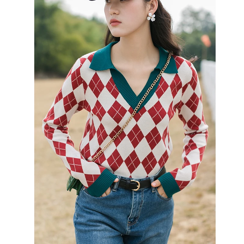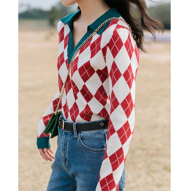 Женский трикотажный свитер, в клетку, с длинным рукавом и V-образным вырезом, осень 2020