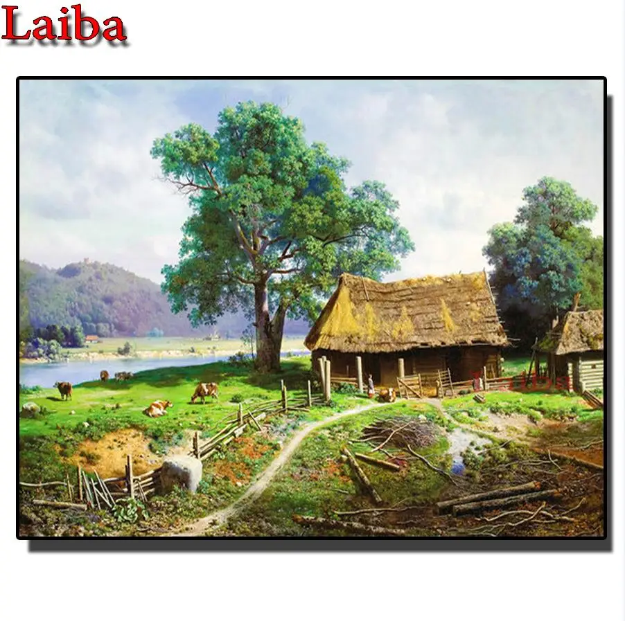 Алмазная живопись Diy, ландшафт, деревня, ферма, искусственная кожа, Круглая Мозаика, корова, дерево, озеро, натуральное украшение, игла